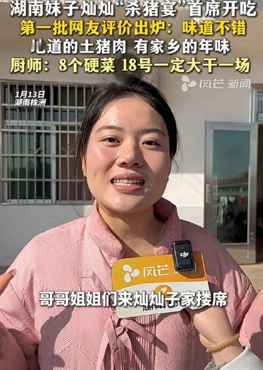 呆呆家的刨猪宴散场了,灿灿家的又要开始了,湖南妹子灿灿豪气放话,自己也准备了10头猪,准备18号进行宴席欢迎四方来客。 灿灿说起自己办这个宴席的初衷,是想让那些感觉不到年味儿的“城巴佬”们来她家乡做客,感受一下浓浓的年味,自己也可以火一把。 现在已经组建好了五湖四海的厨师团队,确保每一个人都可以吃上热汤,热菜,灿灿家的刨猪宴应该更周到一些吧,毕竟时间安排的不紧张,有充足的时间准备。 不管这个妹子是不是想火想当网红,能够拿出10头猪来请大家白吃白喝,够了不起了吧。