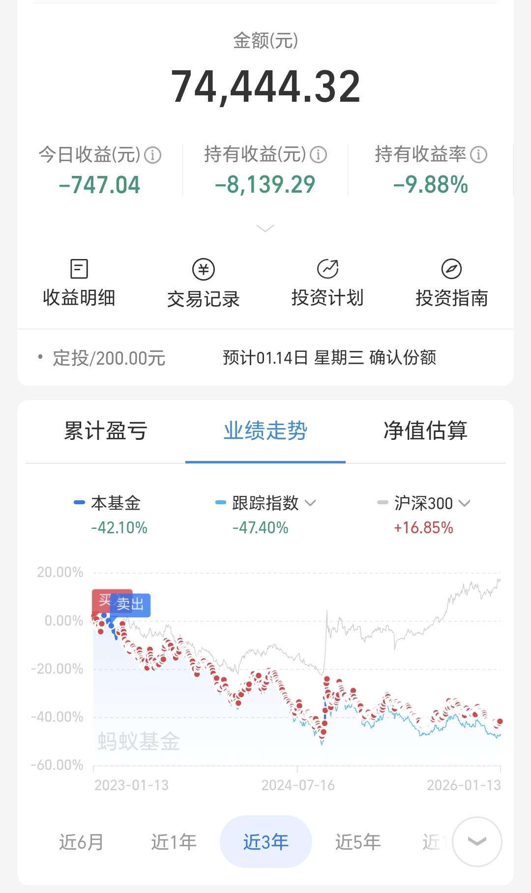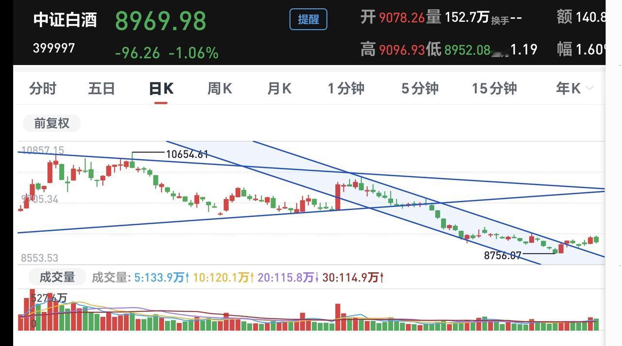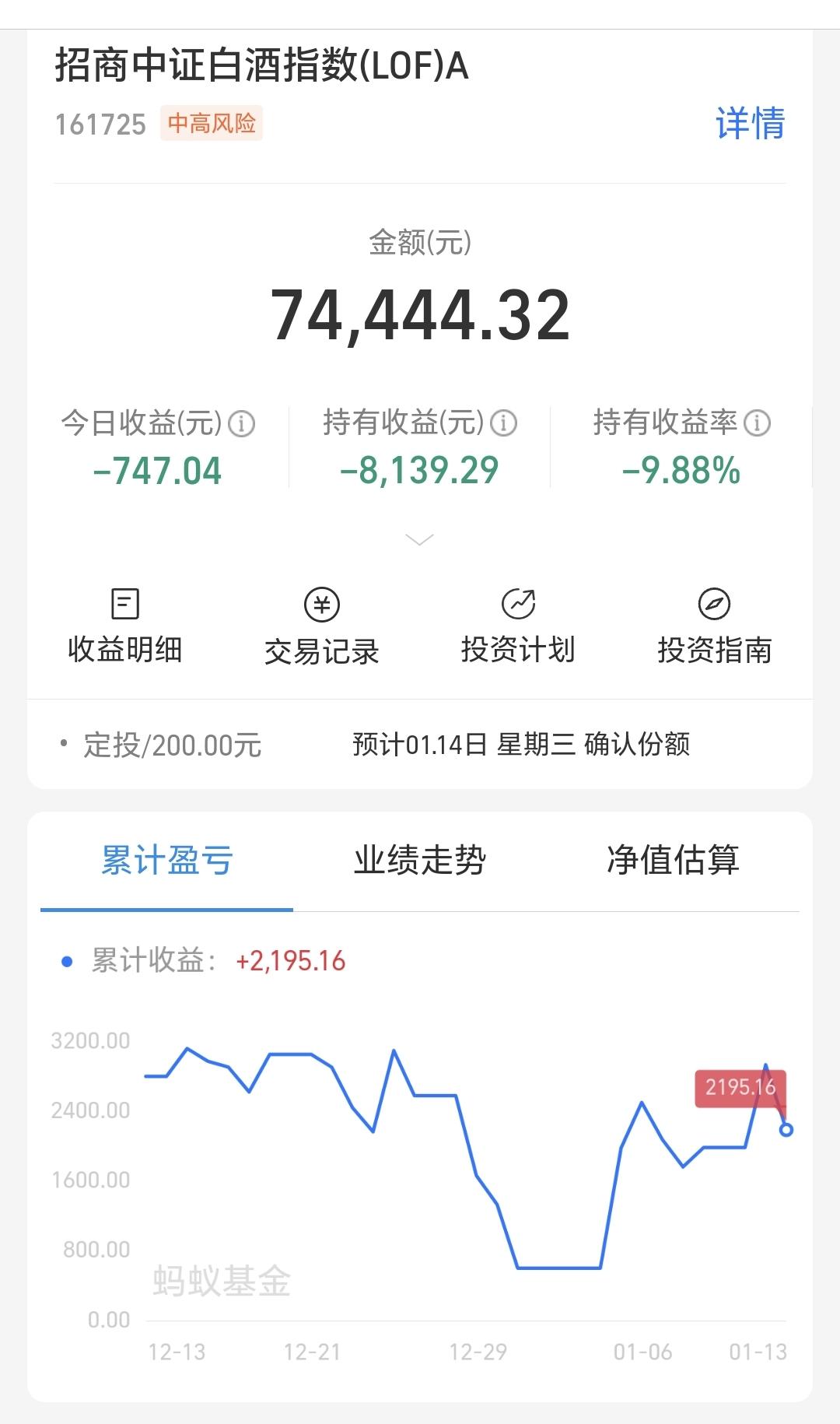 基金:白酒板块应该怎么办 白酒板块今天下跌,今天基本上跌掉了昨天的上涨幅度,下跌了0.83%,持有人数在所有板块当中排名第15位,这个板块今天加仓排行榜进下面的截图3,持有人数排行榜进下面的截图4,排名第一的都是招商中证白酒。 我们来看一下下面的截图5,这是白酒板块日K线图,从图中可以看出,我画了两条倾斜向下的斜线,这是白酒板块日线级别短期下跌通道,前段时间的上涨,突破了这个下跌通道的上轨,这段时间是在下跌通道上轨的上方震荡,白酒板块日线级别短期下跌趋势有可能已经被改变,持有的人可以继续持有,进场不可以太过着急,设置好定投就可以了。 这只基金我持有74444元,持有亏损8139元,持有亏损率9.88%,累计收益2195元,每天定投200块钱,见下面的截图6。 我们来看一下下面的截图7,这是白酒板块近三年以来的走势图,从图中可以看出,近三年以来这只基金下跌了42%,我在相对高位进行了止盈,然后是一路定投和手动到现在,正是因为这些定投和手动,才使得我现在的持有亏损率只有10%左右。 我每天都会分享我的观点,我的观点只代表我个人的看法,不能作为你操作的依据,据此操作后果自负。