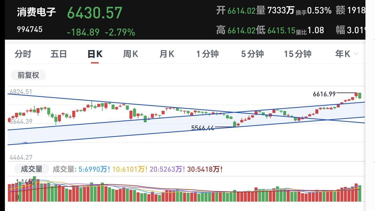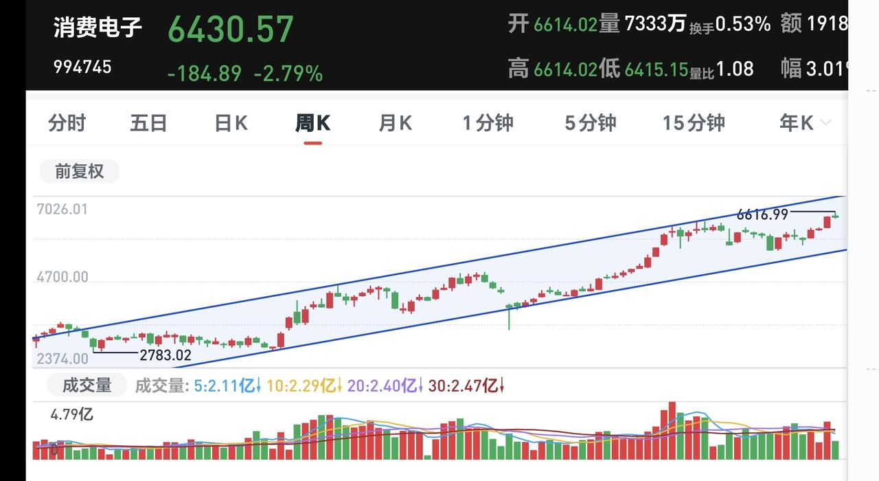 基金:消费电子板块应该怎么办 消费电子板块今天下跌,净值更新下跌了2.23%,持有人数在所有板块中排名第36位,这个板块今天加仓排行榜见下面的截图3,持有人数排行榜见下面的截图4,排名第一的都是华夏消费电子。 我看一下下面的截图了,这是消费电子板块日K线图,从图中可以看出,我画了两条倾斜向上的斜线,这是消费电池板块日线级别上涨通道,前段时间上涨突破了这个上涨通道的上轨,然后一直上涨到昨天,今天的大跌对昨天的阳线来了一个阴包阳,高位阴包阳不是一个好事情,急需来一个再创新高走势。 我们来看一下下面的截图6,这是消费电子板块周K线图,从图中可以看出,我画了两条倾斜向上的斜线,这是消费电子板块周线级别上涨通道,现在的位置处于这个上涨通道内,今天的下跌并没有跌破这个上涨通道的下轨,持有的人可以继续持有,除非跌破这个上涨通道的下轨,才可以考虑要不要止盈出来观望。 我每天都会分享我的观点,我的观点只代表我个人的看法,不能作为你操作的依据,据此操作后果自负。