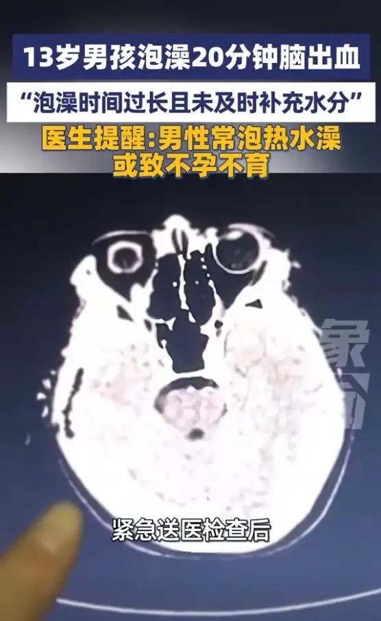 “悲剧还是发生了!”1月13日,河南郑州,一男孩去澡堂泡澡,泡了20多分钟搓背时,师傅突然发现男孩没有反应,紧急送医检查后,发现竟然已经脑出血!最终被送进ICU抢救,目前还没脱离危险!网友:飞来横祸啊! 谁也想不到,一次普通的洗澡会让孩子躺进ICU。这个13岁男孩飞飞(化名)在热气腾腾的澡堂里泡了二十多分钟,搓背师傅正准备给他服务时,突然发现孩子一动不动,怎么叫都没反应。 家人火速将飞飞送到医院,检查结果显示颅内出血。郑州大学第一附属医院PICU的医生接手抢救时发现,孩子处于嗜睡状态,情况非常危险。 医生仔细询问后找到了原因,澡堂温度过高,飞飞长时间浸泡在热水中,身体水分大量流失又没有及时补充,导致血液浓缩,最终引发脑出血。高温环境下,人体毛细血管扩张,心脑等重要器官的血液供应相对减少,这对发育中的孩子尤其危险。 脑出血对儿童来说极其凶险,哪怕抢救及时,也可能留下后遗症。孩子年龄越小,泡澡时出现低血压和休克的风险越大,男性经常长时间泡40℃以上的热水澡,甚至可能影响生育能力。儿童泡澡水温建议38℃以下、时长不超过10分钟。 洗澡本应是件放松的事,但温度和时间的把控直接关系安全,泡澡时间不宜过长,水温不要过高,过程中要及时补充水分。对于有高血压家族史的孩子,更要特别注意避免高温环境。 飞飞的意外给所有家长敲响了警钟,日常生活中的普通活动,也可能隐藏着意想不到的风险。 各位读者你们怎么看?欢迎在评论区讨论。