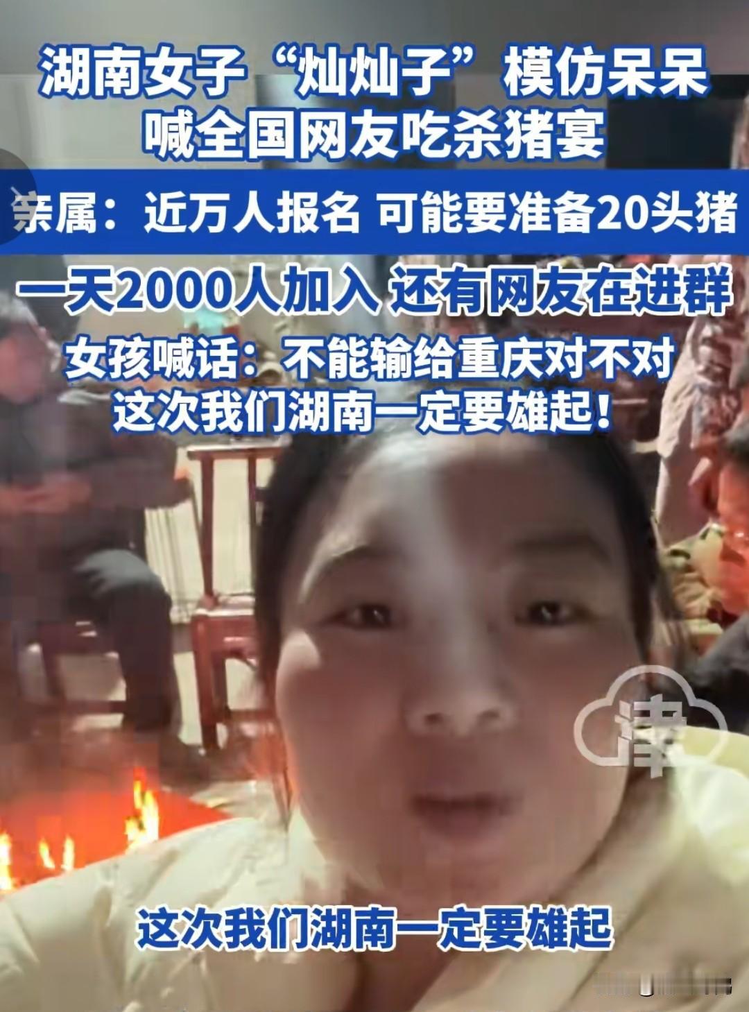 株洲刨猪宴翻车了!灿灿一句话遭全网痛批,真实目的被质疑,网友群嘲。 继合川呆呆刨猪汤后,湖南株洲灿灿跟进,目前已有1万多人报名,起初2头猪现在已经加到19头猪,而且还有粉丝加送10头猪,也就是差不多30头猪,但这场跟风规模越大,随着灿灿得意忘形,以及家人口不择言,遭到全网痛批,这件事起因很简单。 这两天,灿灿家不断来人,这其中大多数都是网红以及媒体的人,少数是本地人来踩点,网红以及媒体就地取材,不断采访灿灿以及其的家人,随后有些话不经大脑思考就这么脱口而出。 比如,灿灿面对采访多次称: “不能输给重庆对不对,这次我们湖南一定要雄起” “湖南人不能“输给”重庆人,因为我不想丢脸”。灿灿这两句话一出遭群嘲。 不止如此,还有网友爆料称: “灿灿在直播间开口要嘉年华,导致直播间被封”,虽然也有网友帮灿灿接受当时只是口嗨而已。但灿灿的真实目的仍被质疑。 多家媒体也报道称: “灿灿对嘉年华的渴望”,也难怪当时看到呆呆直播10w+人,礼物满天飞,瞬间心动发帖跟风。 大言不惭的说: “她们家有猪我们家也有猪,她们有老爸我们也有!” 看到这里,株洲灿灿算是翻车,网友纷纷劝导,最近别再直播接受采访了,很怕到时候,什么都准备好了却少人来。 也有网友说: “有目的性的都会因为达不到目的而适得其反,没目的性的就会获得意料之外的惊喜!” 还有网友说: “想要的是年味,不是拿来对比的,初心不一样,出发点不一样了” 希望灿灿这几天,稍停一会儿,好好准备18日的刨猪宴,真如她所说的: “让大家开心而来,满意而归。” 对此,你怎么看?