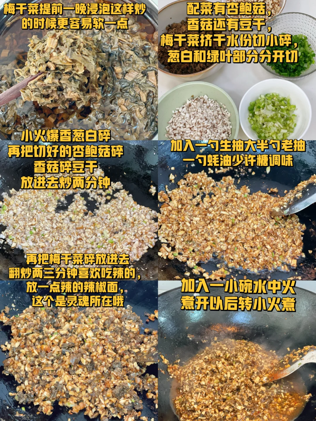 2. 配菜有杏鲍菇,香菇还有豆干,梅干菜挤干水份切小碎,葱白和绿叶部分分开切