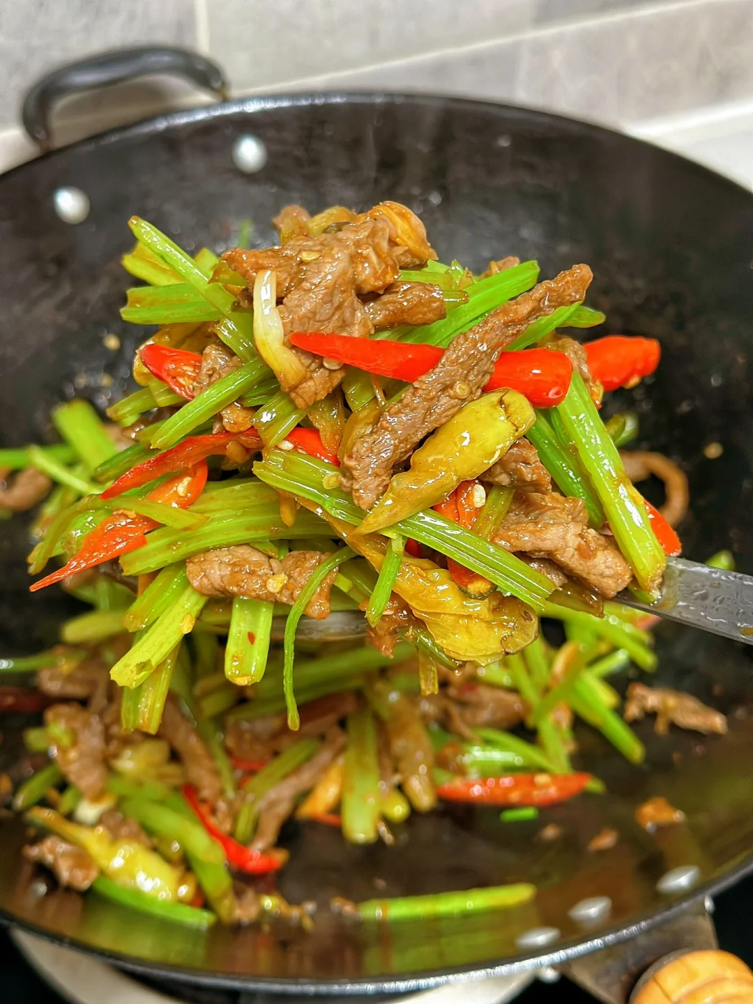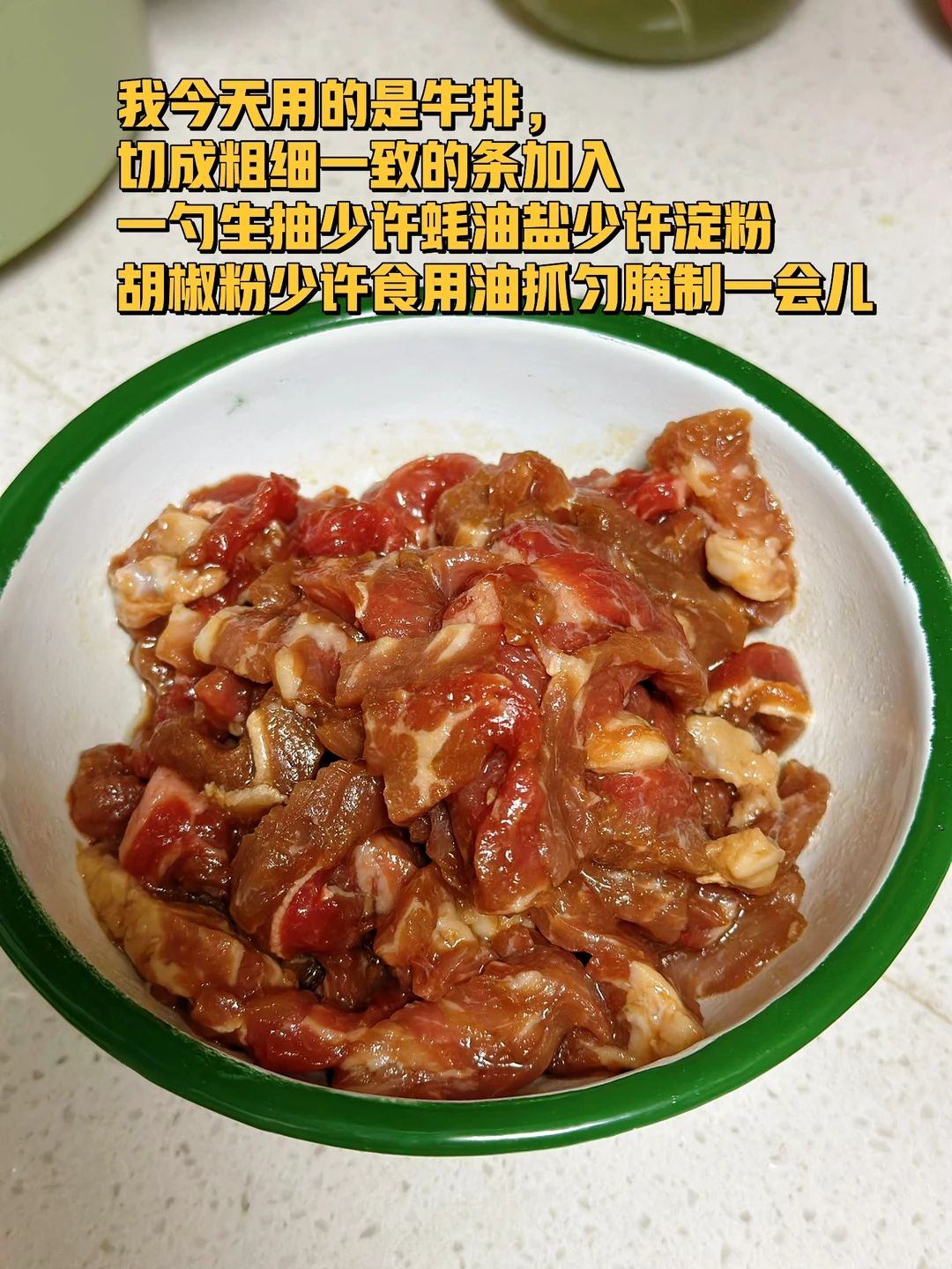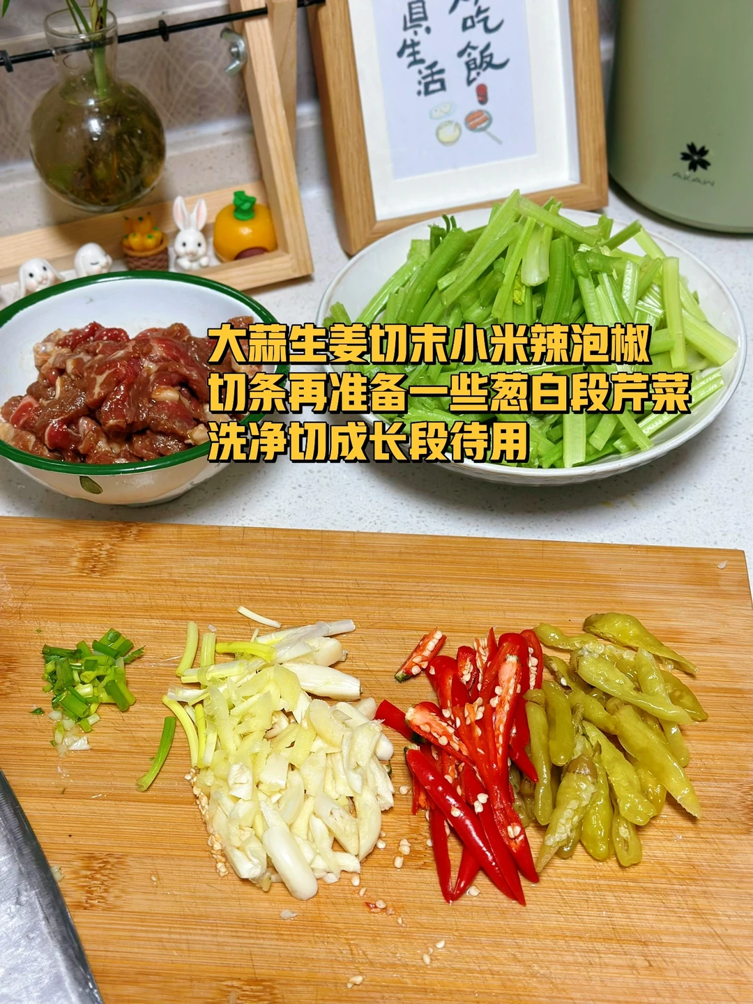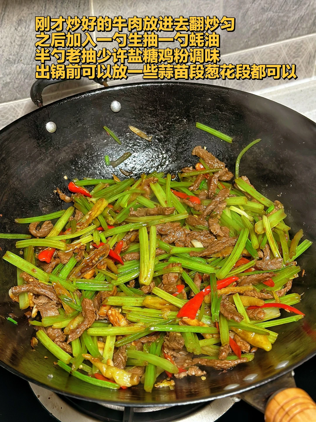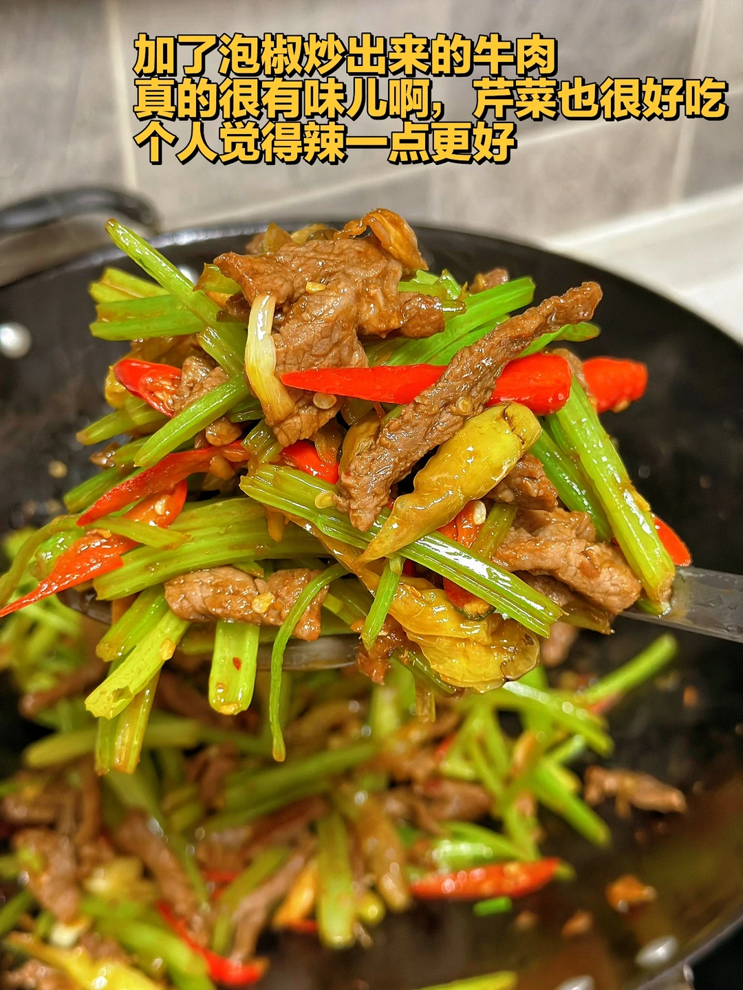 自从开始减肥之后,我们家已经快大半年都没有买过猪肉了,每次去牛排牛肉也会多买一些回来之后分袋装好一次吃的量,吃的时候拿出来解冻也很方便以前家里是商用冰箱现在搬到这边来之后就感觉冰箱太小了,冷冻室都塞不下了,所以得赶紧把买的牛肉吃掉 1. 我今天用的是牛排,切成粗细一致的条加入一勺生抽少许蚝油盐少许淀粉少许食用油抓匀腌制一会儿 2. 大蒜生姜切末小米辣泡椒切条再准备一些葱白段芹菜洗净切成长段待用 3. 锅里放入少许油腌制好的牛肉放进去转大火快速滑炒熟 4. 然后把牛肉捞起来待用,注意的是炒牛肉的时候锅里的汁儿不要哦 5. 重新洗锅上油小火炒香大蒜生姜泡椒小米辣葱白段 6. 接着把切好的芹菜段放进去转大火快速翻炒两三分钟 7. 加入一勺豆瓣酱,这个是我自己做的,你们可以放别的自己喜欢的酱都可以 8. 刚才炒好的牛肉放进去翻炒匀之后加入一勺生抽一勺蚝油半勺老抽少许盐糖鸡粉调味出锅前可以放一些蒜苗段葱花段都可以 加了泡椒炒出来的牛肉真的很有味儿啊,芹菜也很好吃 个人觉得辣一点更好