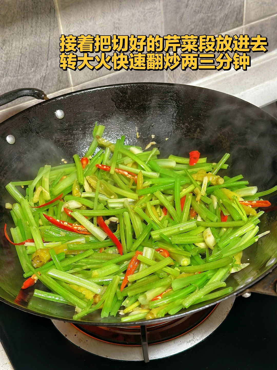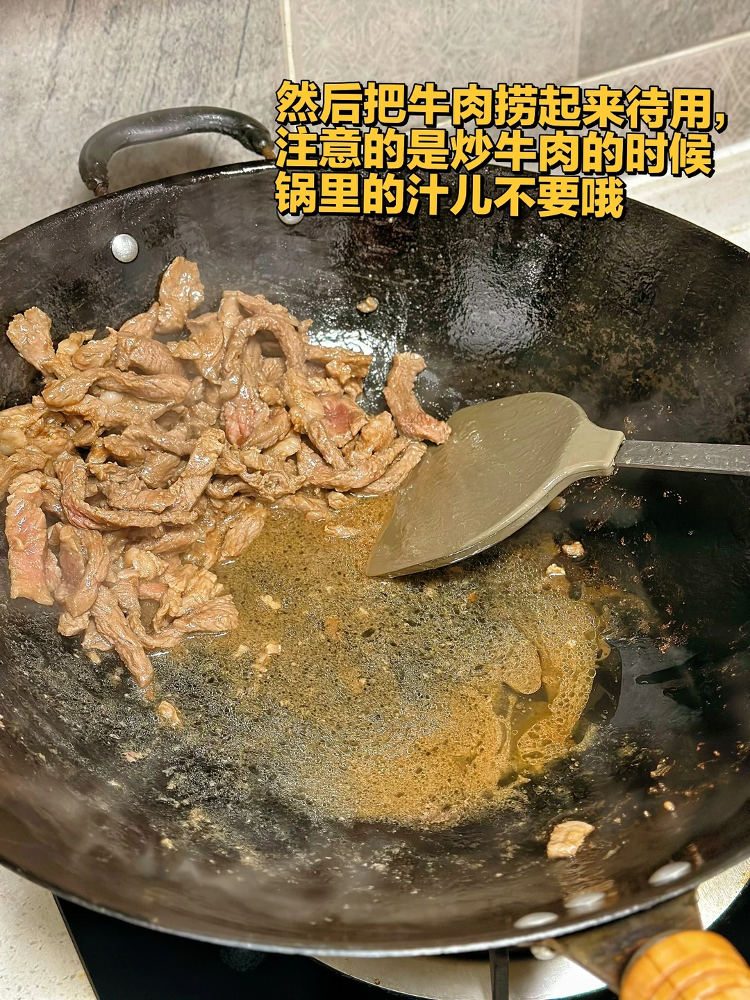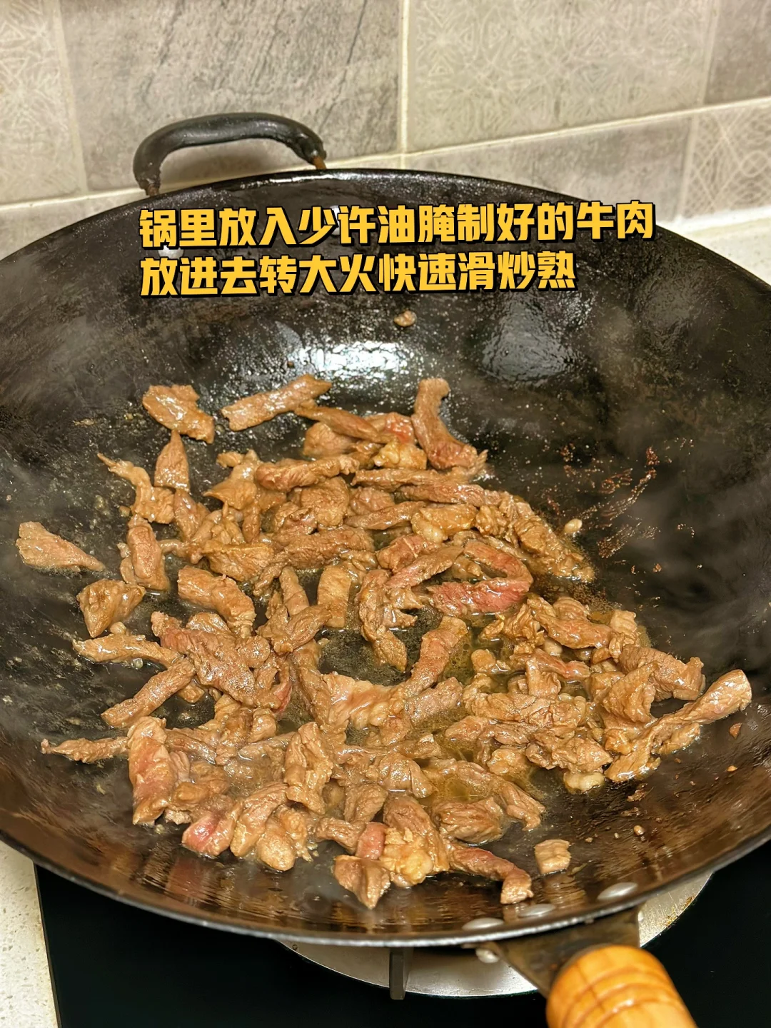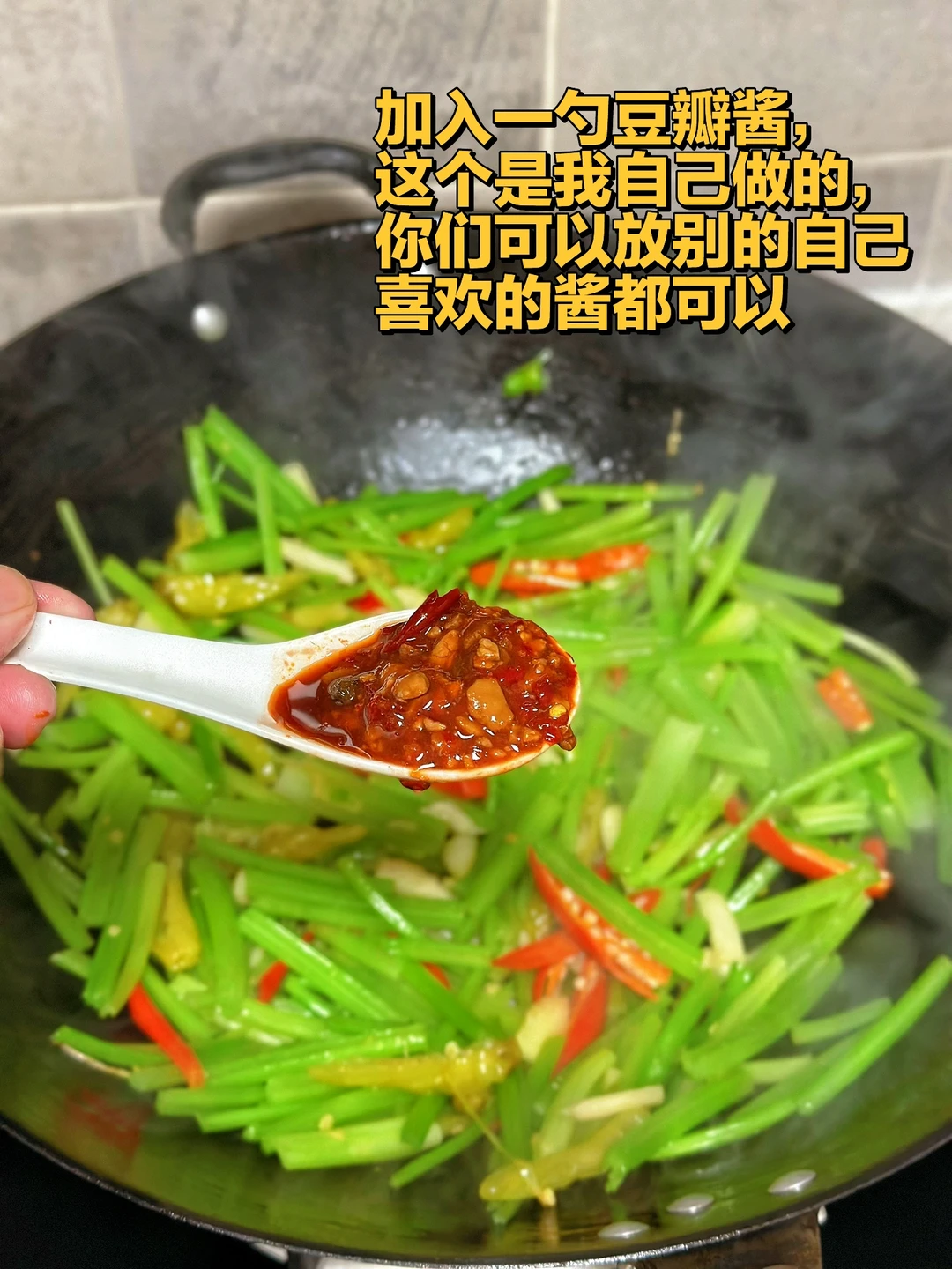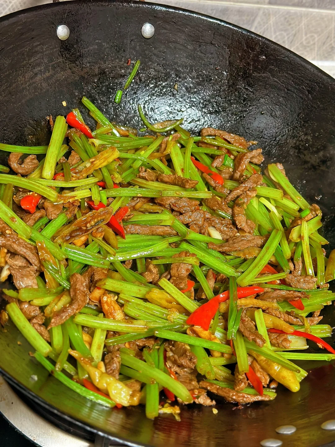 自从开始减肥之后,我们家已经快大半年都没有买过猪肉了,每次去牛排牛肉也会多买一些回来之后分袋装好一次吃的量,吃的时候拿出来解冻也很方便以前家里是商用冰箱现在搬到这边来之后就感觉冰箱太小了,冷冻室都塞不下了,所以得赶紧把买的牛肉吃掉 1. 我今天用的是牛排,切成粗细一致的条加入一勺生抽少许蚝油盐少许淀粉少许食用油抓匀腌制一会儿 2. 大蒜生姜切末小米辣泡椒切条再准备一些葱白段芹菜洗净切成长段待用 3. 锅里放入少许油腌制好的牛肉放进去转大火快速滑炒熟 4. 然后把牛肉捞起来待用,注意的是炒牛肉的时候锅里的汁儿不要哦 5. 重新洗锅上油小火炒香大蒜生姜泡椒小米辣葱白段 6. 接着把切好的芹菜段放进去转大火快速翻炒两三分钟 7. 加入一勺豆瓣酱,这个是我自己做的,你们可以放别的自己喜欢的酱都可以 8. 刚才炒好的牛肉放进去翻炒匀之后加入一勺生抽一勺蚝油半勺老抽少许盐糖鸡粉调味出锅前可以放一些蒜苗段葱花段都可以 加了泡椒炒出来的牛肉真的很有味儿啊,芹菜也很好吃 个人觉得辣一点更好