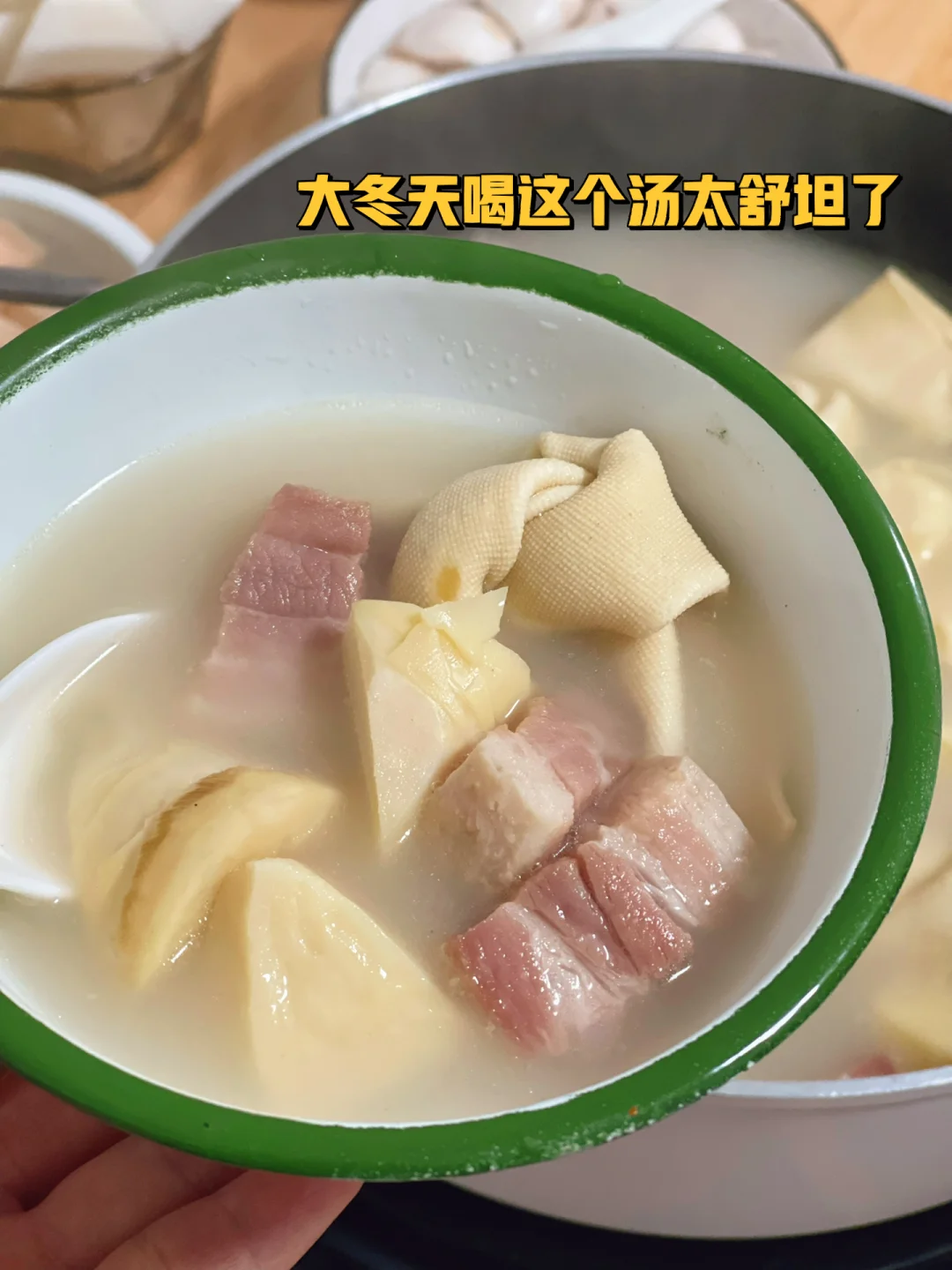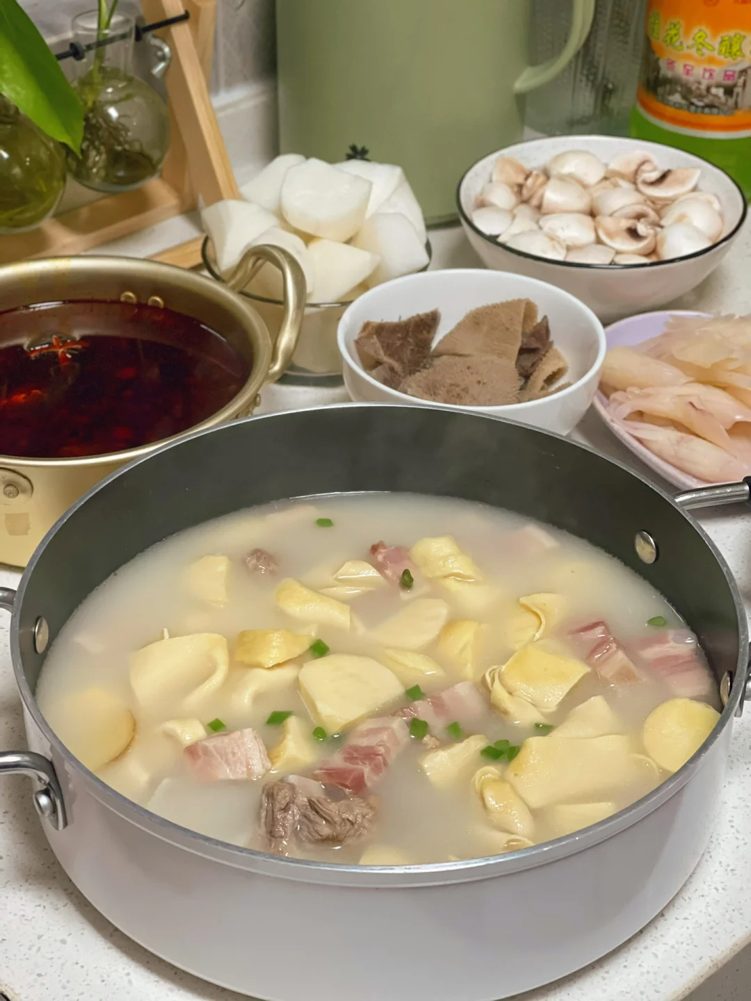 5. 大火煮开以后转中小火盖上盖子煮35到40分钟以后揭开盖子发现嗯哼一锅奶白色的汤就好啦