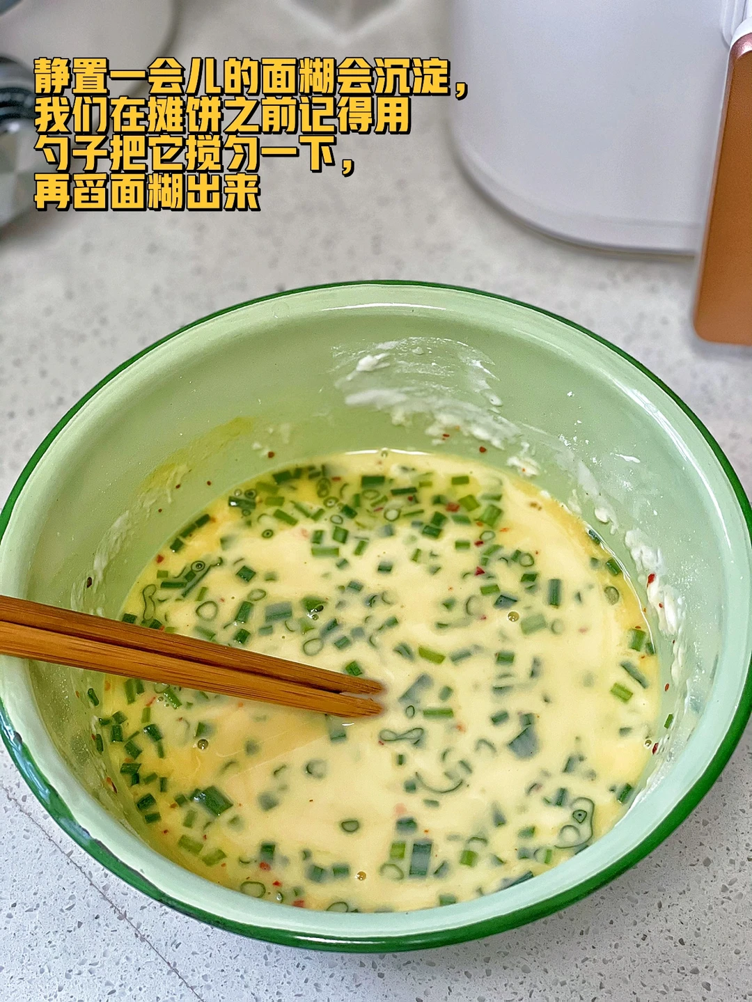 2. 静置一会儿的面糊会沉淀,我们在摊饼之前记得用勺子把它搅匀一下,再舀面糊出来
