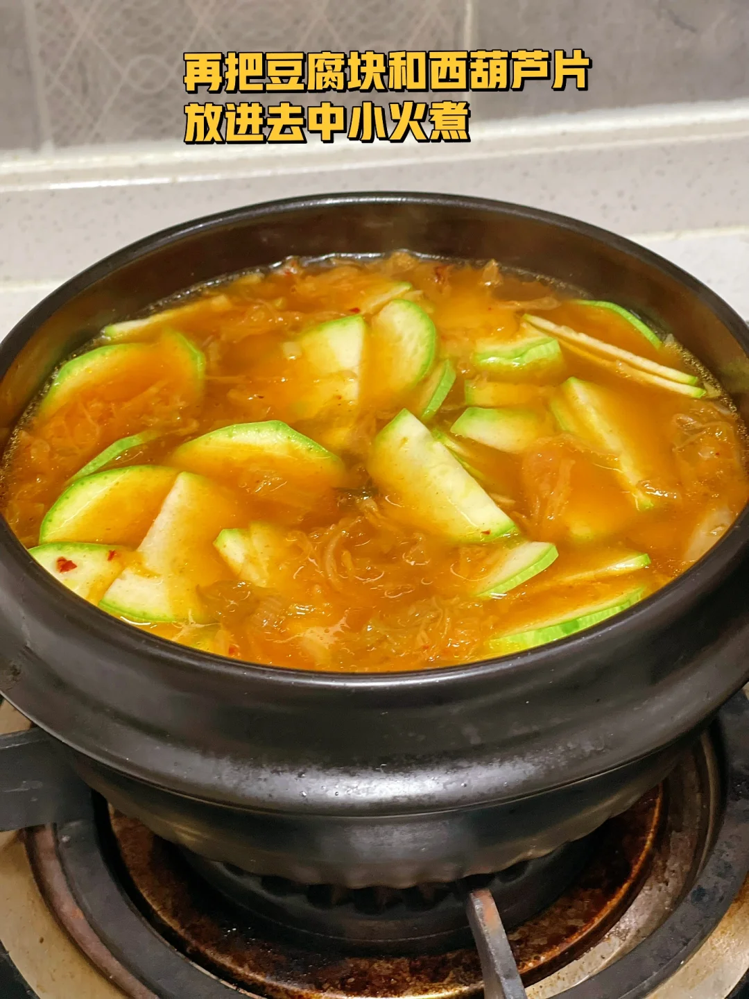 4. 再把豆腐块和西葫芦片放进去中小火煮