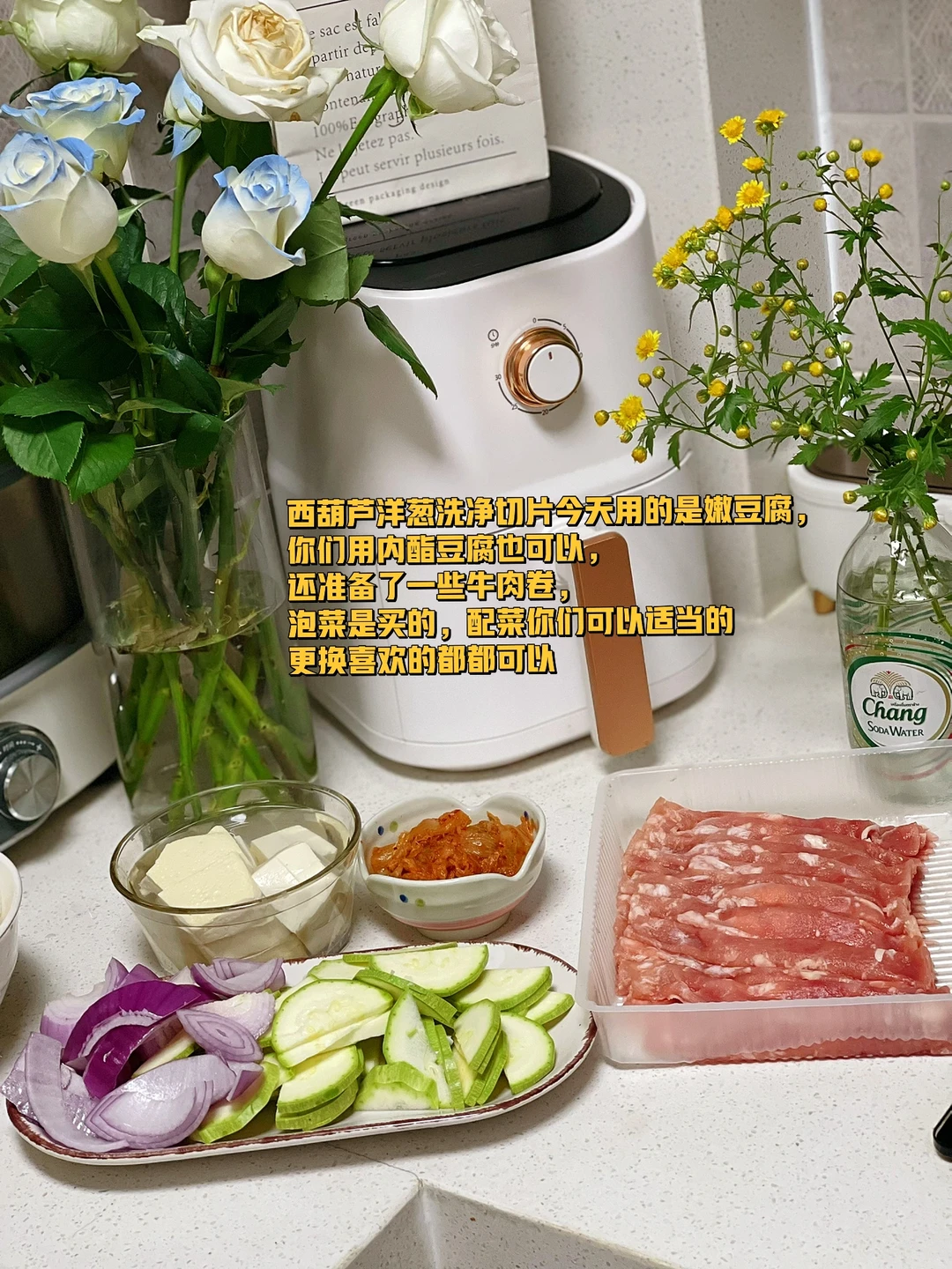1. 西葫芦洋葱洗净切片今天用的是嫩豆腐,你们用内酯豆腐也可以,还准备了一些牛肉卷,泡菜是买的,配菜你们可以适当的更换喜欢的都都可以