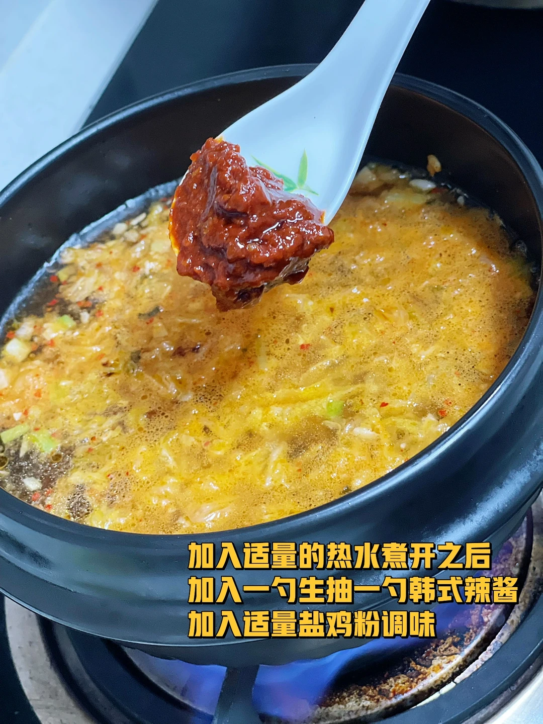 3. 加入适量的热水煮开之后加入一勺生抽一勺韩式辣酱,加入适量盐鸡粉调味