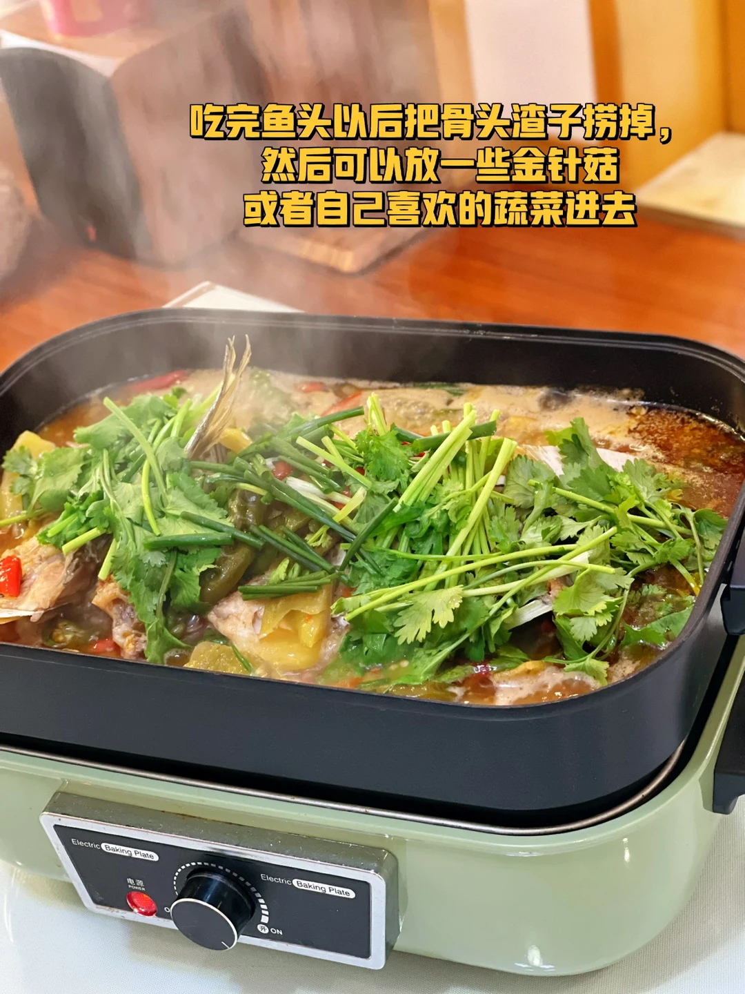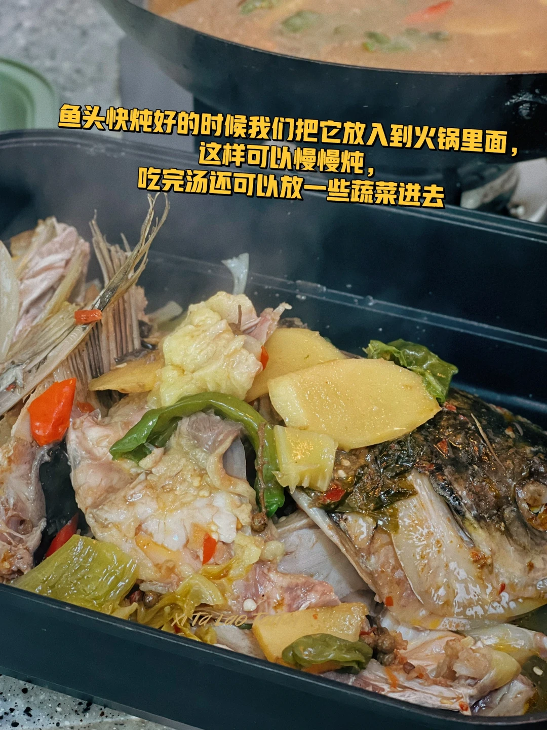 6. 鱼头快炖好的时候我们把它放入到火锅里面,这样可以慢慢炖,吃完汤还可以放一些蔬菜进去