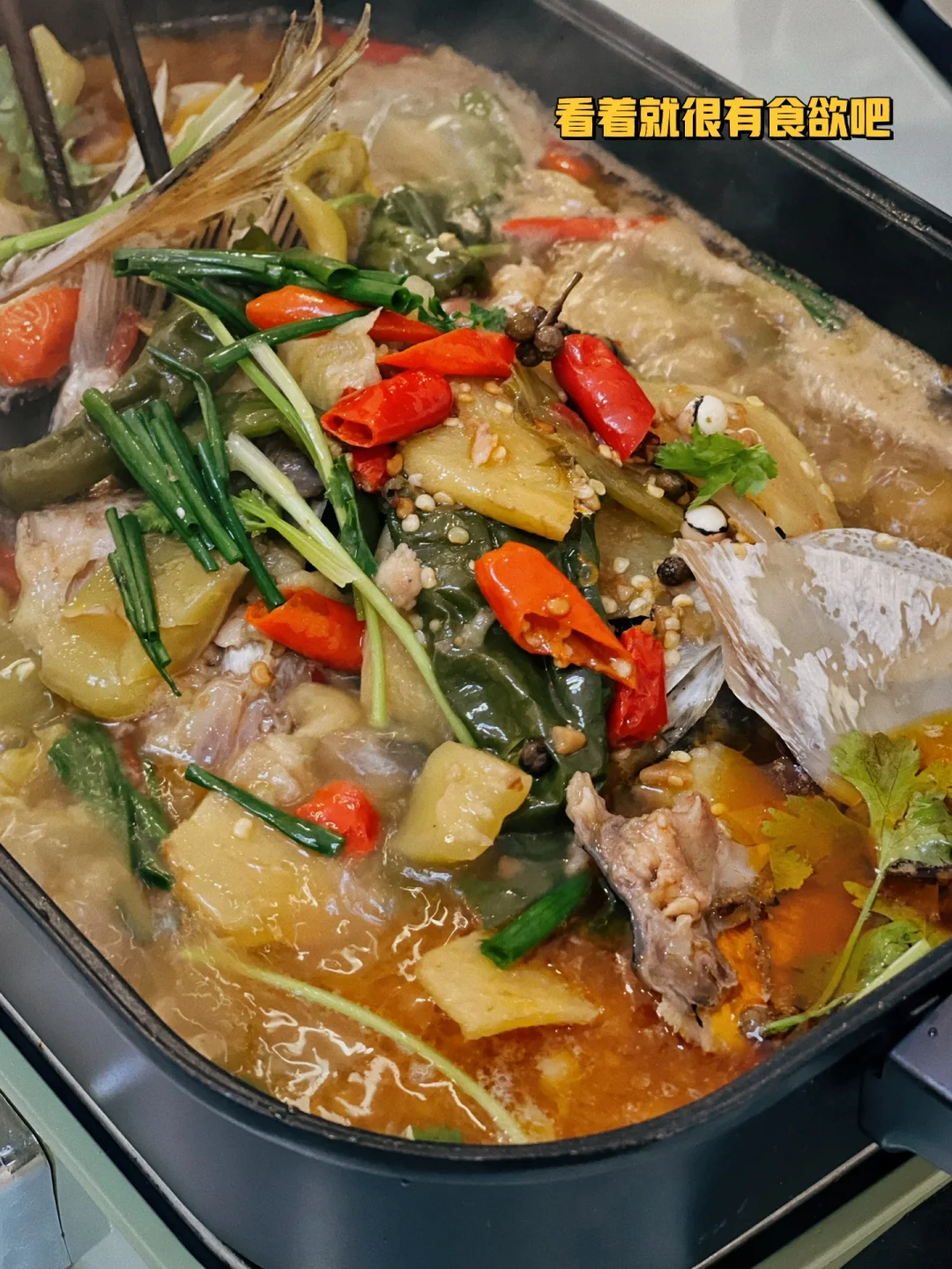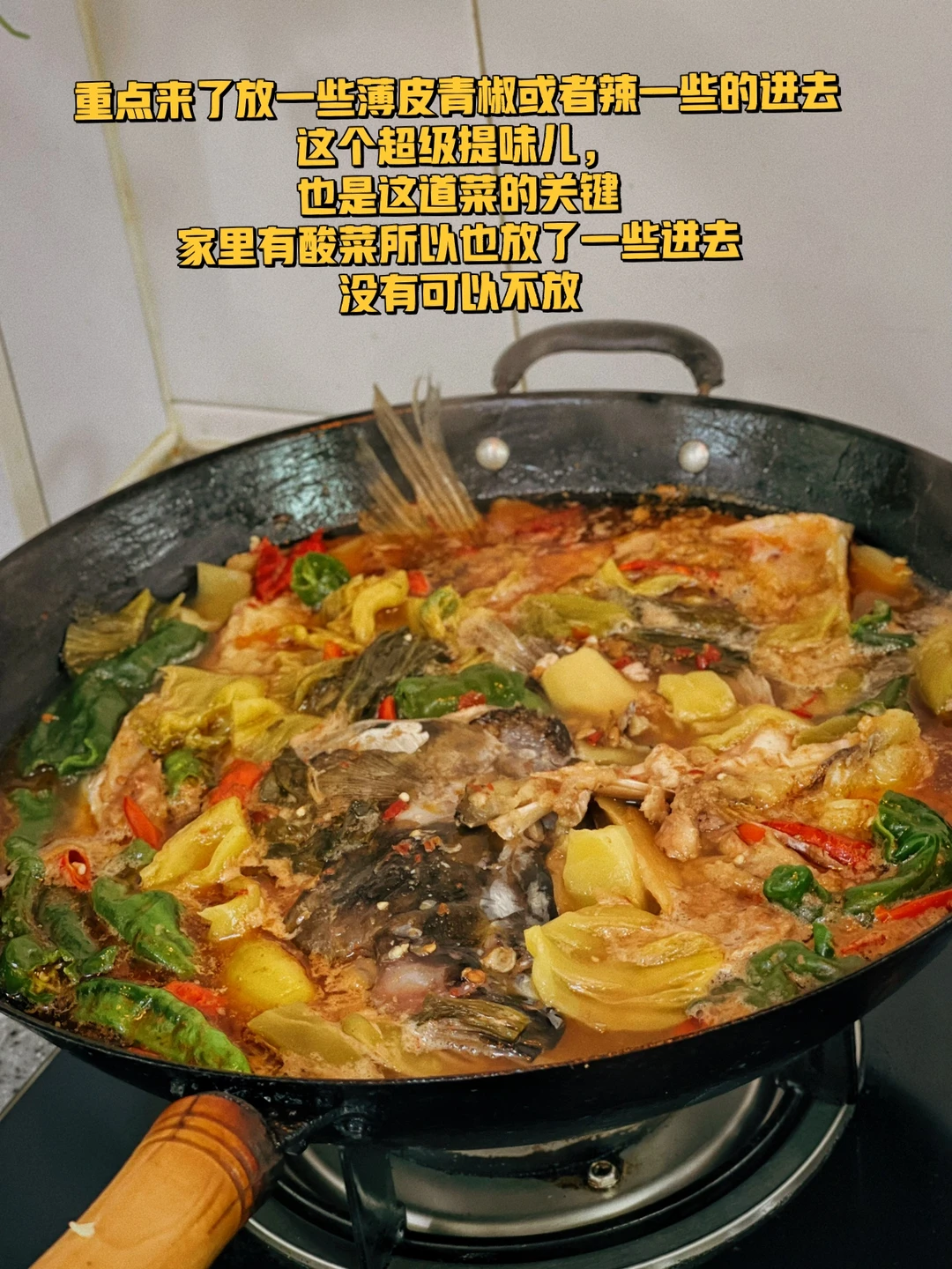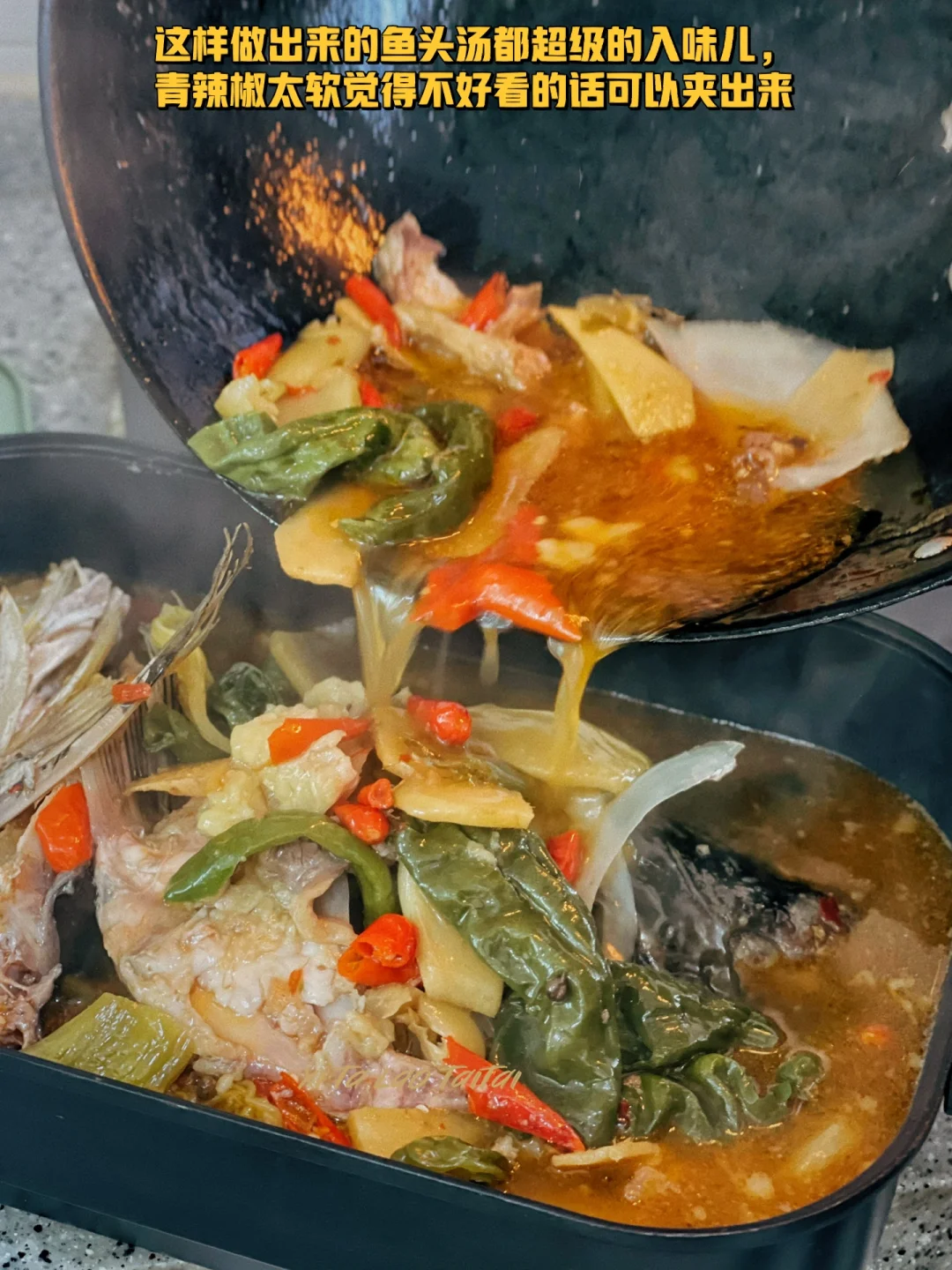 7. 这样做出来的鱼头汤都超级的入味儿,青辣椒太软觉得不好看的话可以夹出来