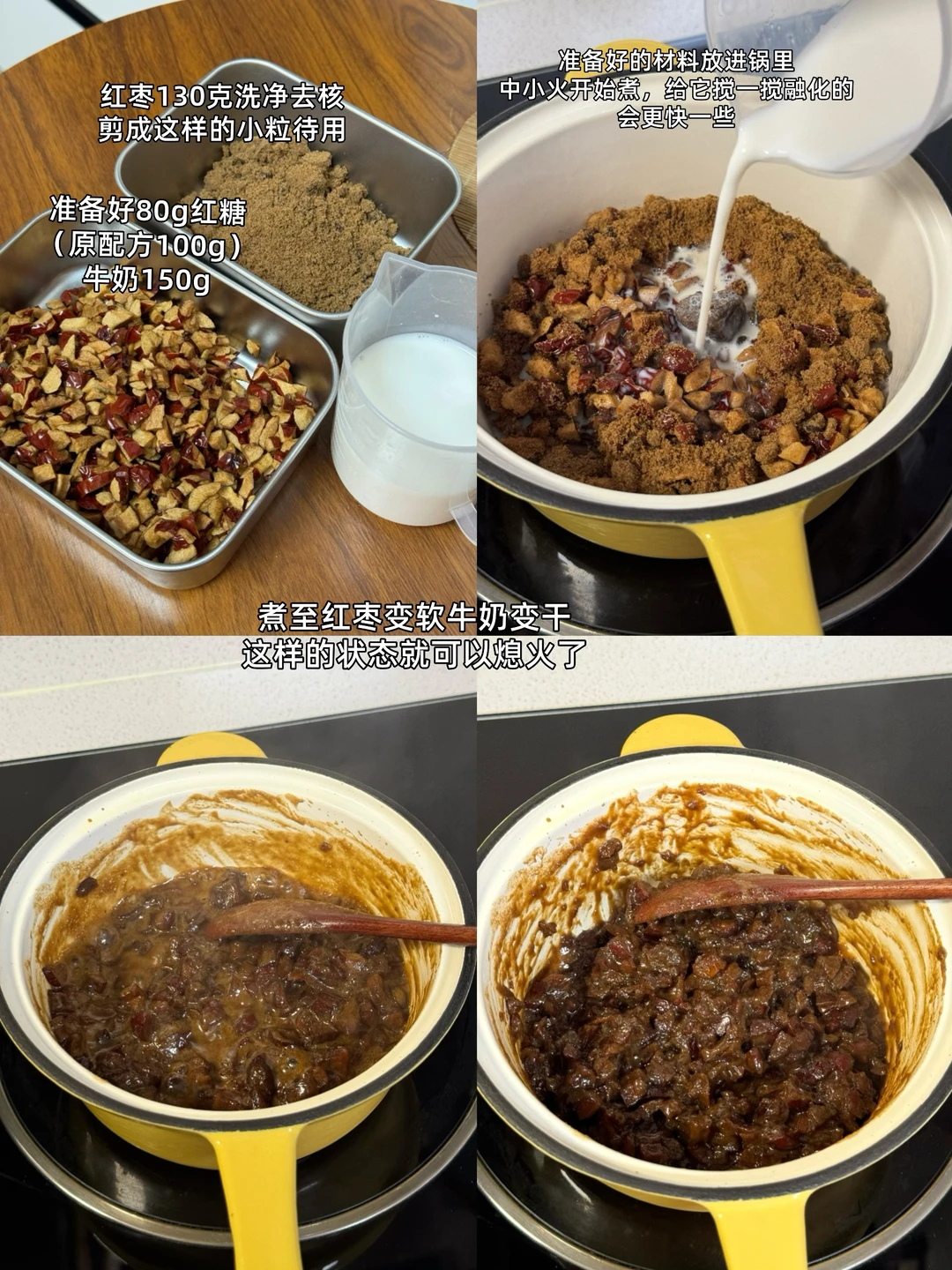 3. 煮至红枣变软牛奶变干这样的状态就可以熄火了