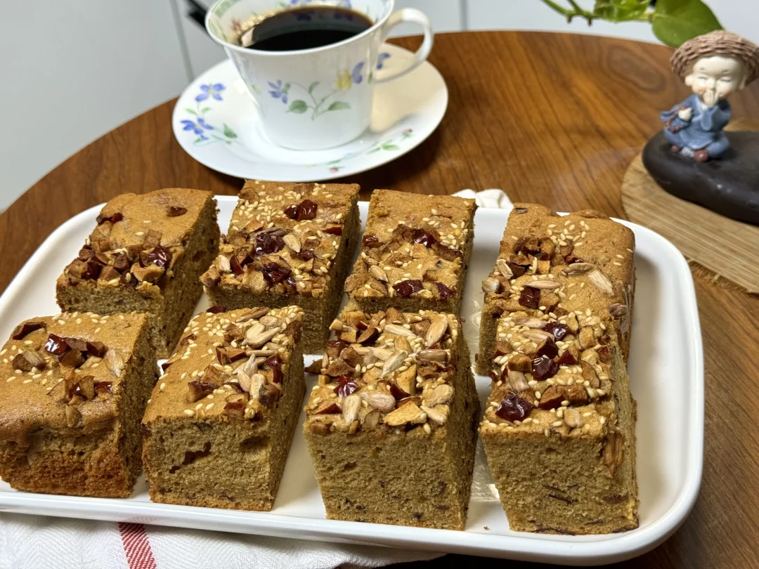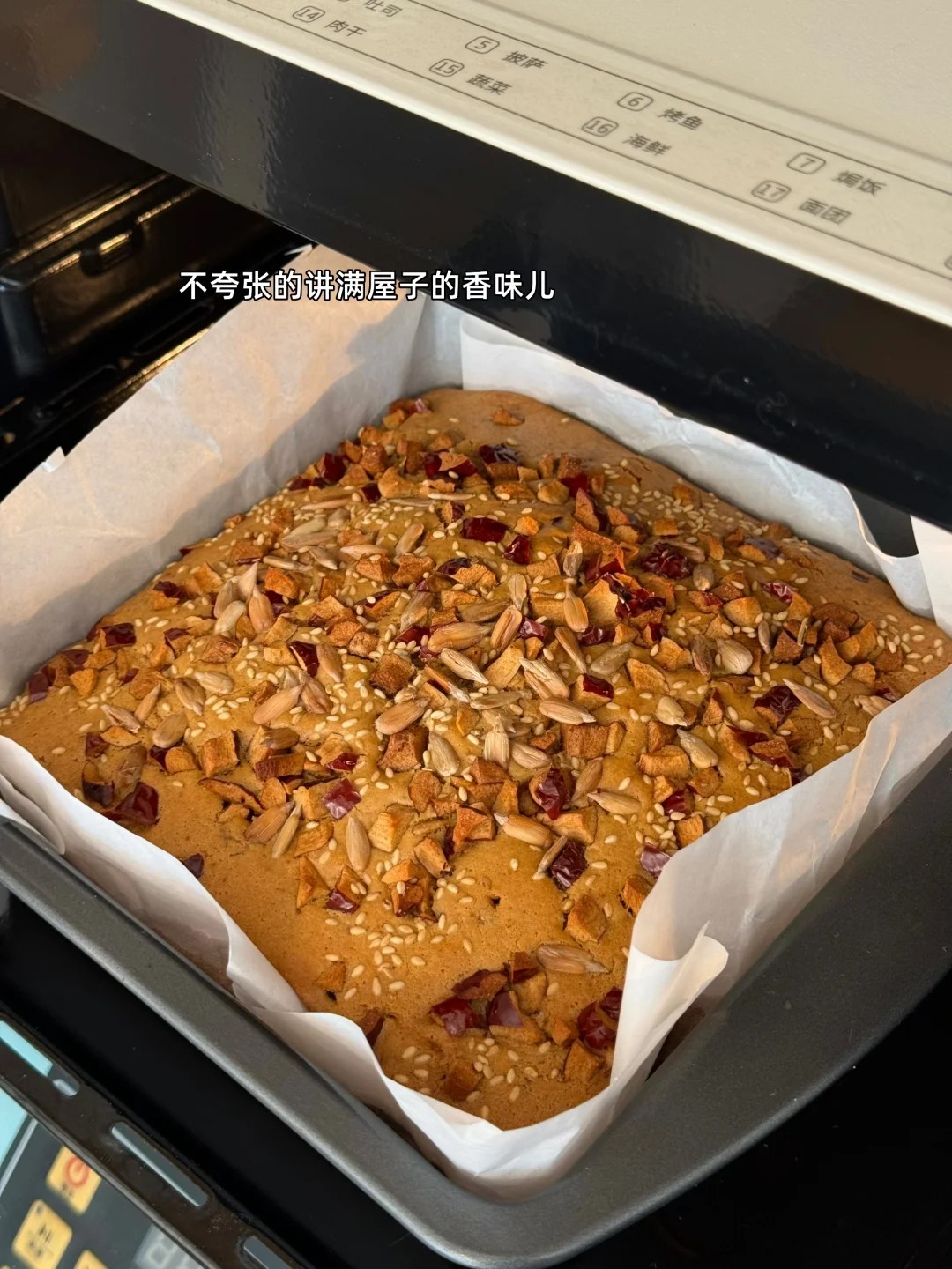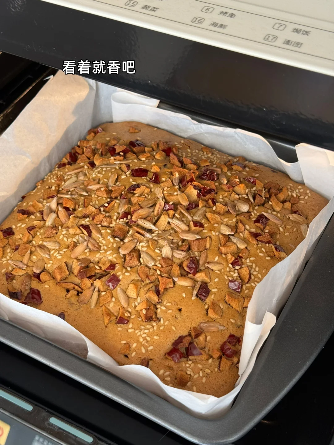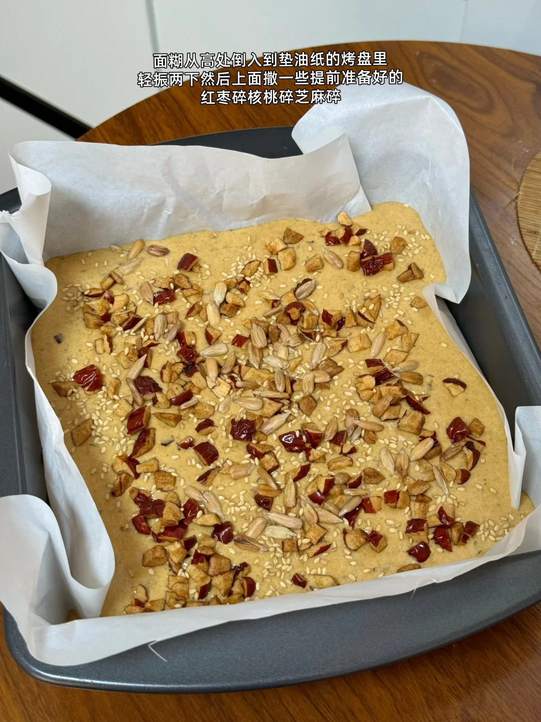 9. 面糊从高处倒入到垫油纸的烤盘里,轻振两下,然后上面撒一些提前准备好的红枣碎核桃碎芝麻碎