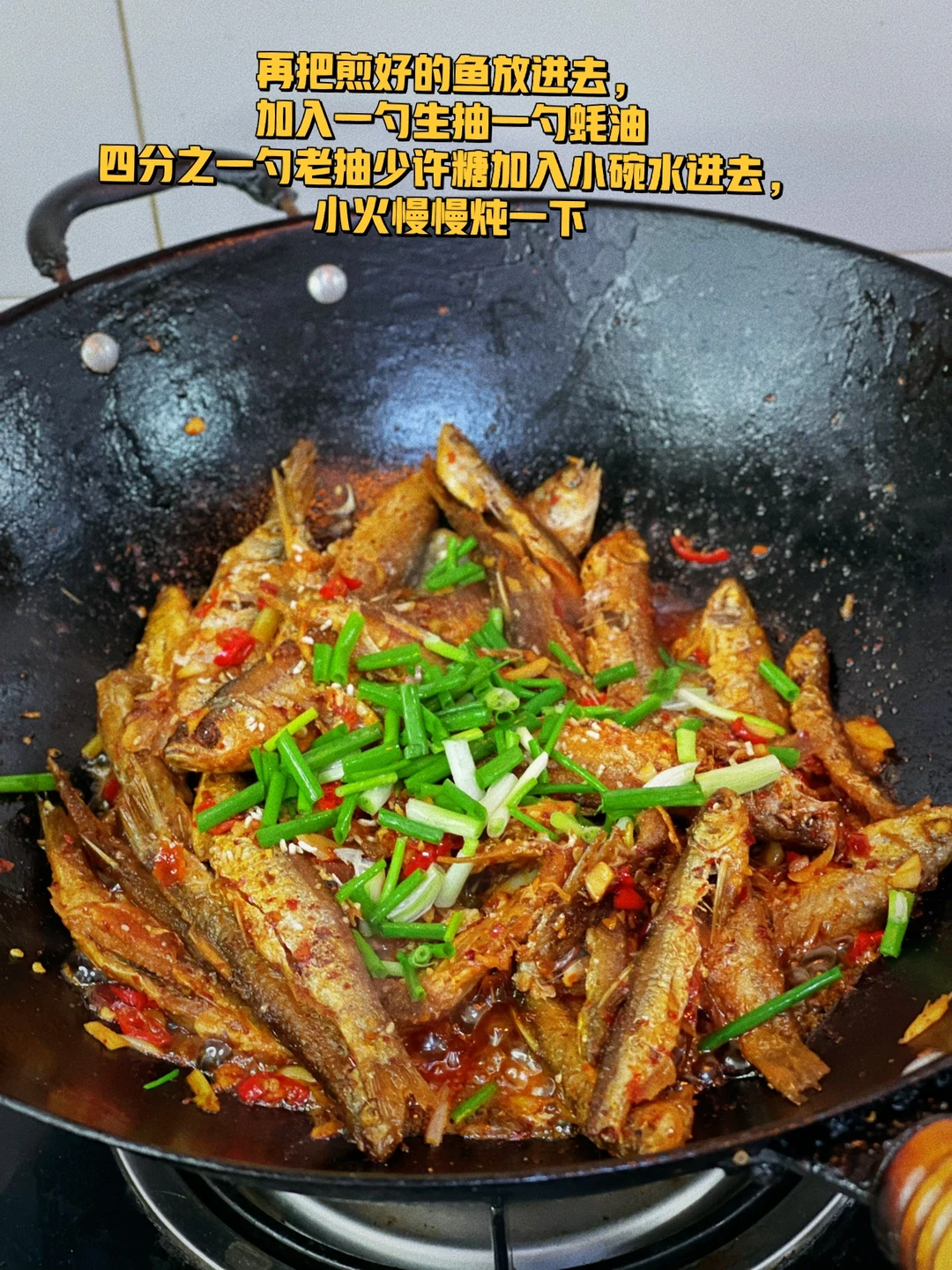 11. 再把煎好的鱼放进去,加入一勺生抽一勺蚝油四分之一勺老抽少许糖加入小碗水进去,小火慢慢炖一下