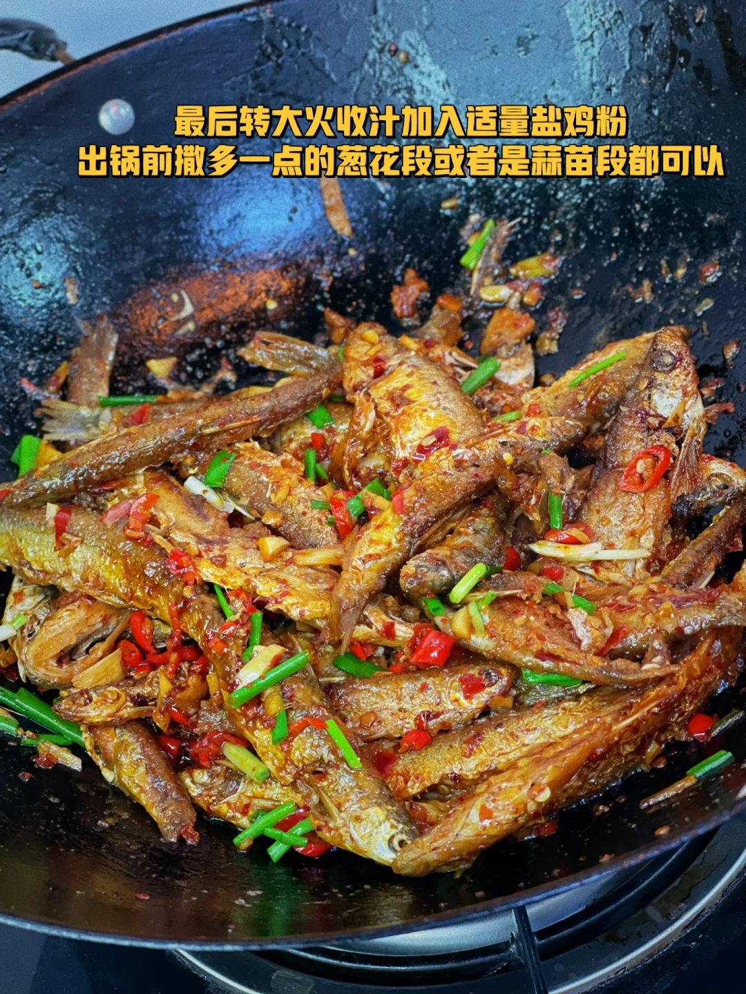 12. 最后转大火收汁加入适量盐鸡粉出锅前撒多一点的葱花段或者是蒜苗段都可以