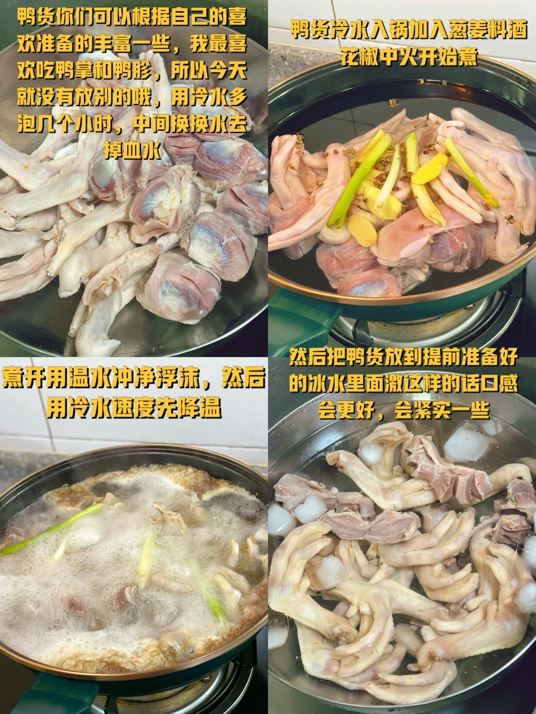 1. 鸭货你们可以根据自己的喜欢准备的丰富一些,我最喜欢吃鸭掌和鸭胗,所以今天就没有放别的哦,用冷水多泡几个小时,中间换换水去掉血水