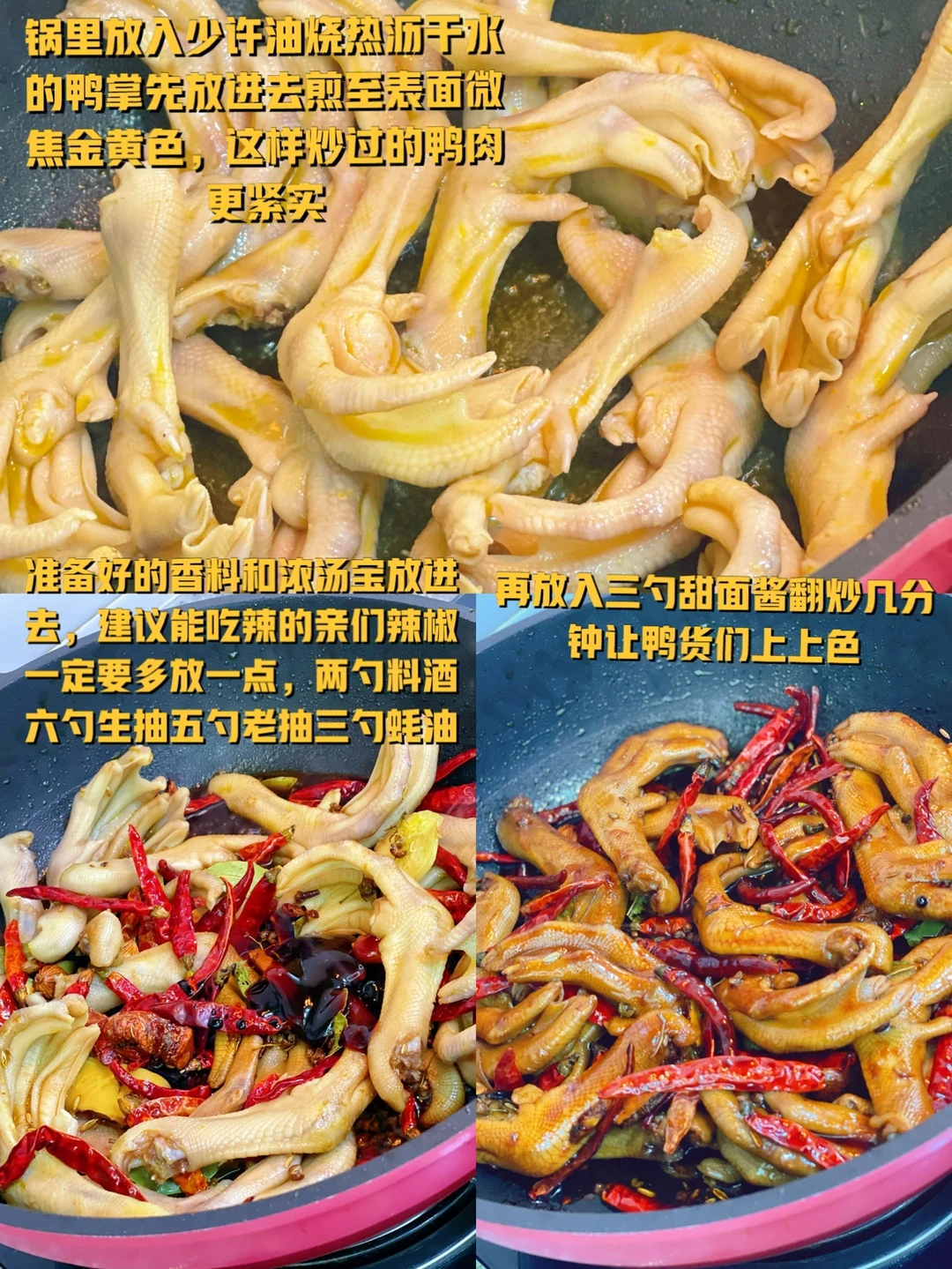 8. 锅里放入少许油烧热沥干水的鸭掌先放进去煎至表面微焦金黄色,这样炒过的鸭肉更紧实