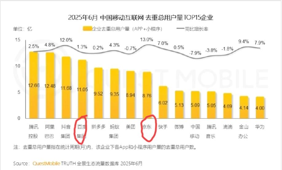 中国移动互联网去重总用户量排名。百度集团排名第四你敢信吗?京东排名用户量同比增长率第一你敢信吗? 从这张表格看来,腾讯、阿里还是稳稳的占据榜一榜二的位置。抖音集团在绝对增长数量上是最多的,如果按这种趋势,几年内或可以超过阿里甚至腾讯。 排名前十的互联网企业里面,就美团的用户量是跌的,连微博的用户量也是微增了0.5%。