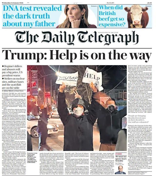 据《每日电讯报》报道,特朗普总统警告伊朗当权者,“杀人者和施暴者”将“付出沉重代价”,并敦促抗议者继续前进。“帮助正在路上。”