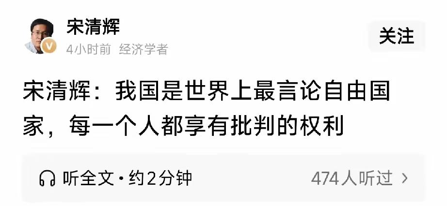 既然宋清辉都说每个人都享有批判的权利,那我高低也要批判他几句。 首先,权利不是绝对的,包括批判的权利和言论自由的权利。任何权利都是有边界的。 其次,批判别人的时候,先要做好自己,如果自己都不咋地,就别对别人指手画脚了。 最后,这个世界还是少一些批判,多一些包容和理解比较好。