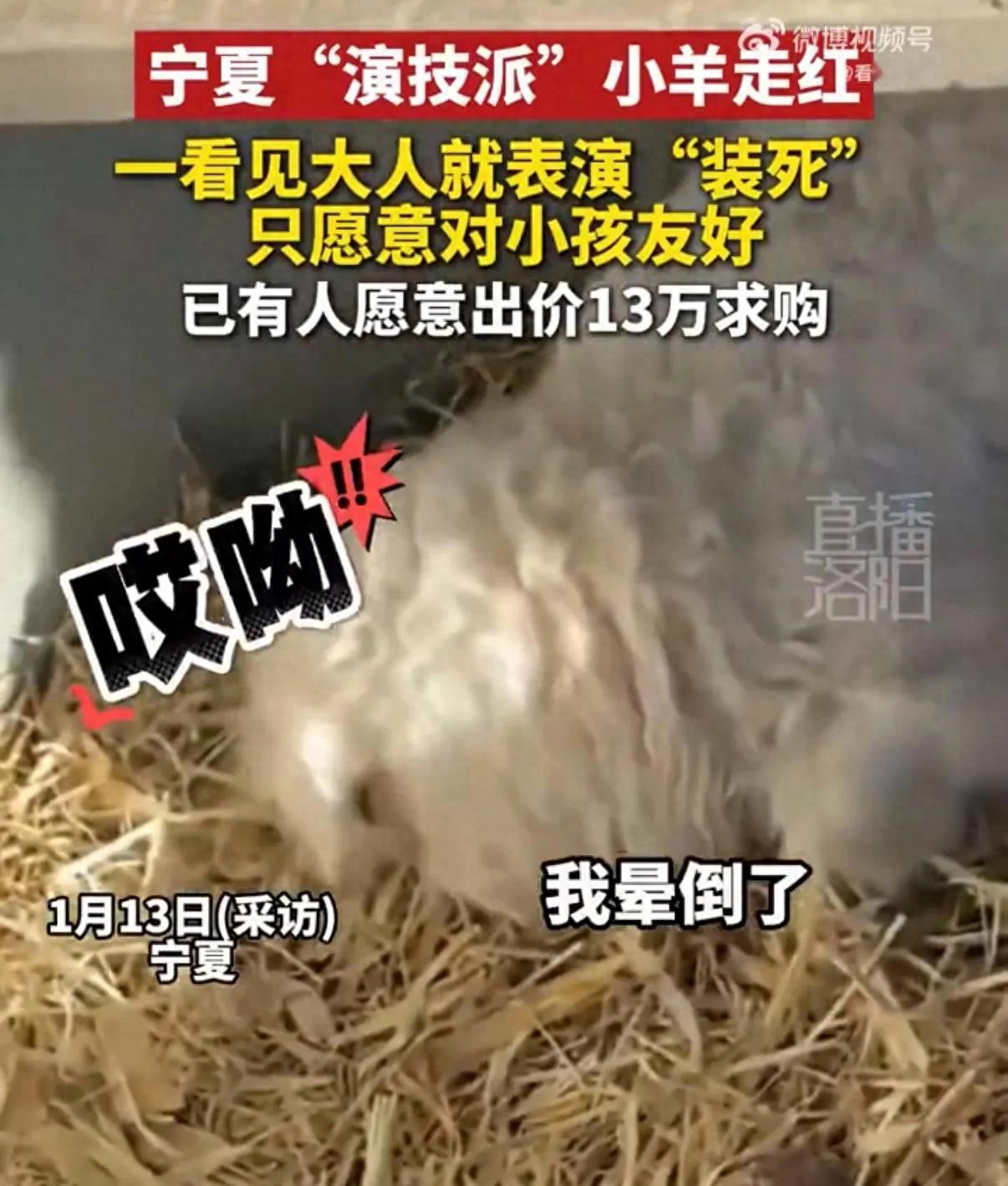 要成精了!宁夏,一男子在网上分享,他家养的一只会“装死”的小羊,只要大人走到它面前它就会立即“装死”,如果是小孩找它玩,它就啥事没有的和孩子们玩耍,正因这小羊可爱又超群的演技,也是引起了网友们的关注和热议。 宁夏平罗县宝丰镇中方村,最近因为一只小羊羔出了名。   这只出生才10天左右的小家伙,既不是品种稀有,也不是长得特别出众,凭的是一手“装死”的绝技,让全网都记住了它。   养殖户金小林第一次发现这小羊的特别,是在赶集卖羊的时候。   那天他带了4只小羊羔去集市,另外3只都顺顺利利卖了出去,唯独这只,成了“滞销品”。   只要有买主上前,伸手想摸摸它,或是弯下腰打量它,这小羊就像被按了开关似的,立马直挺挺地倒在地上,眼睛闭得紧紧的,四肢也绷着不动,连呼吸都像停了。   买主们一看这架势,都以为是只病羊,摇摇头就走了,谁也不想花钱买个麻烦。   可等买主走远了,神奇的一幕就发生了,这小羊会偷偷抬眼瞄一眼,确认没人注意了,就慢悠悠地爬起来,该溜达溜达,该吃草吃草,跟没事羊一样。   金小林一开始也慌了,怕小羊真有什么隐疾,守在旁边观察了好半天,反复试了几次才弄明白,这小家伙根本没病,就是在故意装死。   更有意思的是,这小羊的“装死”还分人。   要是家里的小孩凑过去跟它玩,它就变得特别乖顺,不仅不会躺倒,还会主动蹭蹭小孩的手,跟在小孩身后跑,就算金小林在旁边,也丝毫不影响它跟小孩互动。   养了几十年羊,金小林从没见过这么有灵性的小家伙,家里人也觉得新奇,就把小羊装死的样子拍了下来,发到了社交平台上。   本来就是随手记录,没想着能火,结果这些视频就像被推了流量似的,播放量噌噌往上涨,这只“戏精小羊”的名声也传了出去,不少网友都被它的聪明劲儿圈了粉。   还有人专门私信金小林,想出钱把小羊买走,其中最高的出价都快到13万了。   面对这么高的价钱,金小林在犹豫之后就拒绝了。   他心里有个更实在的想法,小羊有这么高的热度,不如借着这个机会,让更多人知道宁夏的好东西。   金小林说,他们这儿的羊肉肉质鲜嫩,枸杞又大又甜,八宝茶更是地道,这些都是实打实的好特产,就是知道的人太少了。   小羊走红之后,不光网上热闹,村里也跟着热闹了起来。   十里八乡的乡亲们,都特意绕路来金小林家打卡,就为了亲眼看看这只“会装死”的小羊羔。   还有不少外地网友通过私信联系他,说想趁着有空来村里看看小羊,顺便尝尝当地的特产。   网友们对这只小羊的讨论也特别有意思,有人开玩笑说,这小羊肯定是带着前世的记忆来的,上辈子八成是被卖怕了,这辈子才学会用装死保命。   也有人说,这是小羊的生存本能,它能分清谁是善意谁是可能带来危险的,小孩的亲近没有恶意,大人的靠近却可能意味着被买卖,所以才会有不一样的反应。   不管是哪种说法,都能看出大家对这只小羊的喜欢,也认可它的灵性。   曾经因为装死卖不掉的小羊,如今不仅改变了自己的命运,还成了家乡的“宣传符号”