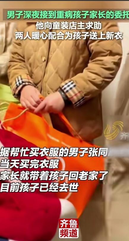 山东济南的深夜,一位外卖骑手接到微信求助,一名家长问他能不能给在肿瘤医院的孩子买一套新衣服。小哥深夜打遍了童装店的电话,给男孩买了最喜欢的红色衣服,赶在男孩还有知觉的时候穿上了体面的新衣服,男孩穿完衣服后,家长带他回家,目前已去世。 山东济南的寒夜里,外卖骑手张同川的手机屏幕亮起,一条微信求助消息跳了出来。   发消息的是肿瘤医院138床患儿的家属,字里行间都透露着着急,想请他帮忙给孩子买一身新衣服。   孩子的时间不多了,家人只想让他走的时候能体面一点。   张同川没多想,立刻问清楚孩子的身高体重,还有孩子喜欢的颜色和款式。   这位家长说孩子喜欢红色,还偏爱奥特曼的图案,这个小小的心愿,成了寒夜里最要紧的事。   张同川骑车,拧动油门冲进夜色里。   这个时候已经是晚上11点,街道早已安静下来,街边的童装店都紧闭着大门,暖黄的灯光被锁在玻璃门里,透着让人无奈的冷清。   张同川没有掉头,他掏出手机,点开地图软件,把能搜到的童装店挨个记下来,然后一个接一个地拨打电话。   忙音在听筒里响了一遍又一遍,拒绝和无人接听成了寒夜里的常态。   终于,在深夜11点半,一通电话被接了起来,电话那头是童装店主潘女士。   她那会儿正在回家的路上,原本已经卸下了一天的疲惫。   但是她听到电话里张同川着急的讲述,听到“孩子生病了,就想穿件新衣服”这句话,潘女士二话不说就掉转车头,朝着店铺的方向赶。   店铺的卷闸门被重新拉起,灯光亮起来的那一刻,像在寒夜里撑开了一把小小的伞。   张同川告诉潘女士孩子来自肿瘤医院,医院里还有上千个处境相似的孩子,孩子喜欢红色和奥特曼。 潘女士在货架间仔细翻找,挑了一件最合身、样式也最讨喜的红色衣服,又细心地叠好、包装。   打包的时候,潘女士突然想起来什么,拿出来一盒玩具,想要让张同川给孩子拿过去,让孩子玩。 张同川沉默了一下,没有接过玩具,只是轻轻地说了一句,孩子可能已经玩不了玩具了。 潘女士正在整理玩具的双手顿了一下,抬起头来,脸上满是不可置信。 她没有再多问细节,只想着要快点,再快点,别耽误了孩子的心愿。   张同川拎着包装好的衣服,骑车往医院赶,风从耳边刮过,却没让他觉得冷。   他冲进病房的时候,孩子还有一点意识。   家属接过衣服,小心地帮孩子换上,红色的新衣穿在身上,孩子的脸上露出了一丝微弱的笑意。   张同川看着这一幕,心里酸酸的,家属要给他衣钱和跑腿费,他摆摆手拒绝了,只轻声说,让妈妈好好陪陪孩子吧。   只是令人遗憾的是,不久之后,这个穿着红衣服的小男孩,最终还是带着所有人的善意,安静地离开了这个世界。   后来,张同川把这件事做成了视频发了出去,潘女士刷到视频的时候,才知道孩子来自肿瘤医院,更知道医院里还有上千个处境相似的孩子。   作为一个母亲,潘女士的心里揪得生疼。   她立刻联系上张同川,把衣服钱一分不少地退了回去,她说,听不得这样的事,孩子太可怜了,这点心意不算什么。   这段深夜里的爱心接力,没有惊天动地的场面,只有两个普通人的挺身而出。   一个是风里来雨里去的外卖骑手,他本可以对陌生的求助视而不见,却愿意在寒夜里奔波,只为了完成一个孩子最后的心愿。   一个是做小本生意的童装店主,她本来就已经下班,却愿意折返店铺,用一件衣服温暖一颗即将凋零的童心。   他们都只是芸芸众生里的普通人,拿着普通的薪水,过着普通的日子。   可就是这样的普通人,在别人最艰难的时刻,伸出了最温暖的手。   他们的善意,不是轰轰烈烈的捐赠,也不是声势浩大的帮扶,只是一件合身的红衣服,一次不图回报的奔波,一份发自内心的共情。   这件红衣服,裹着一个孩子最后的体面。   这份深夜里的善意,藏着一个社会最真实的温度。   它告诉我们,温暖从来都不是少数人的专属,而是无数普通人的举手之劳,是陌生人之间最朴素的同情与共感。