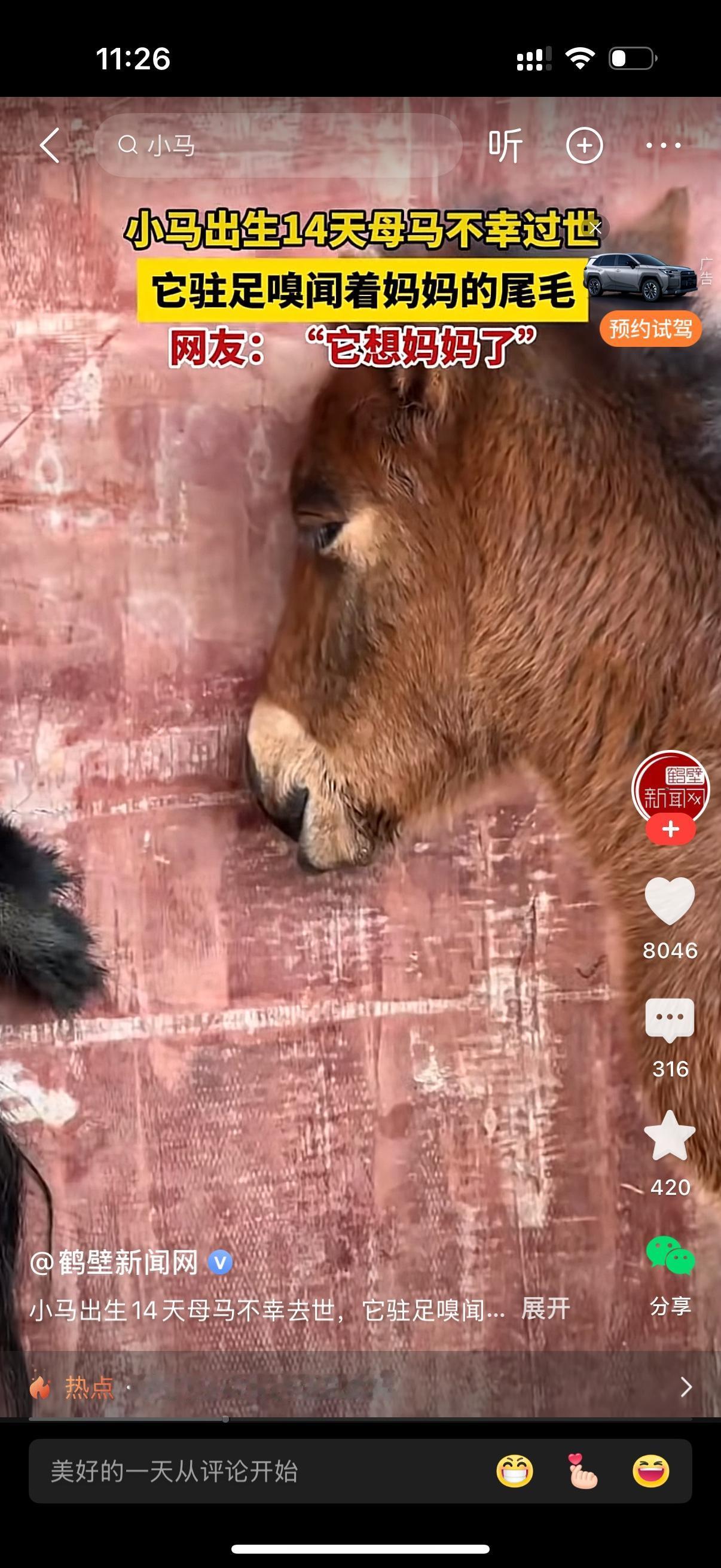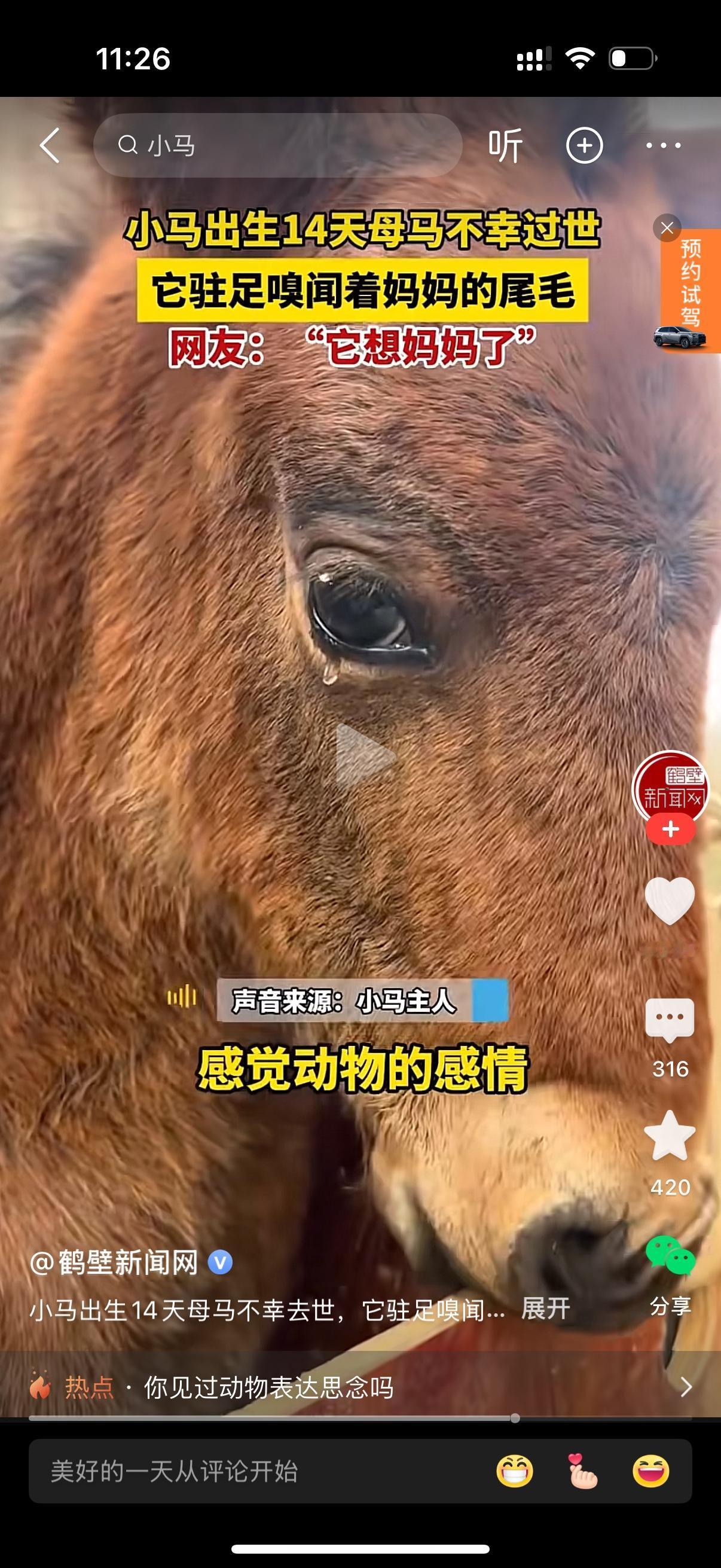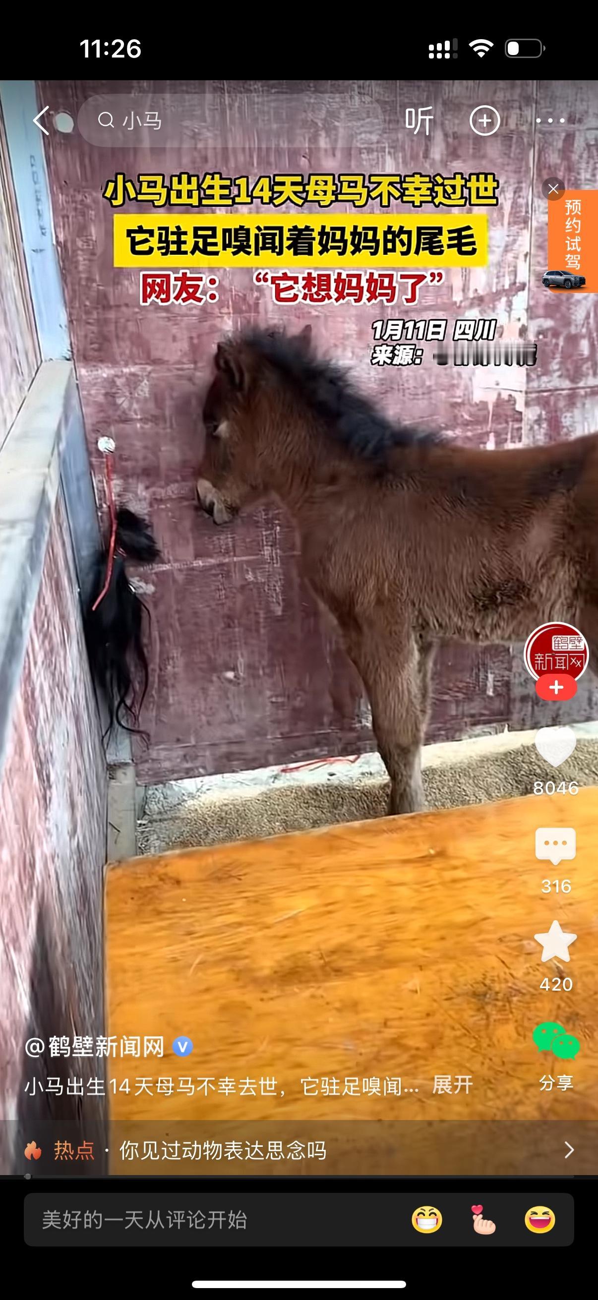 小马出生14天,母马患急性肠梗阻不幸过世。小马驻足闻着妈妈的尾毛,眼角挂着泪水,它想妈妈了。其实有些动物的感情比人更纯粹更真,毕竟他们本身就是单纯天真烂漫。像现在家里养的小狗,比小孩还可爱,还忠诚。这就是为什么有人宁愿养宠物也不要小孩的原因之一。