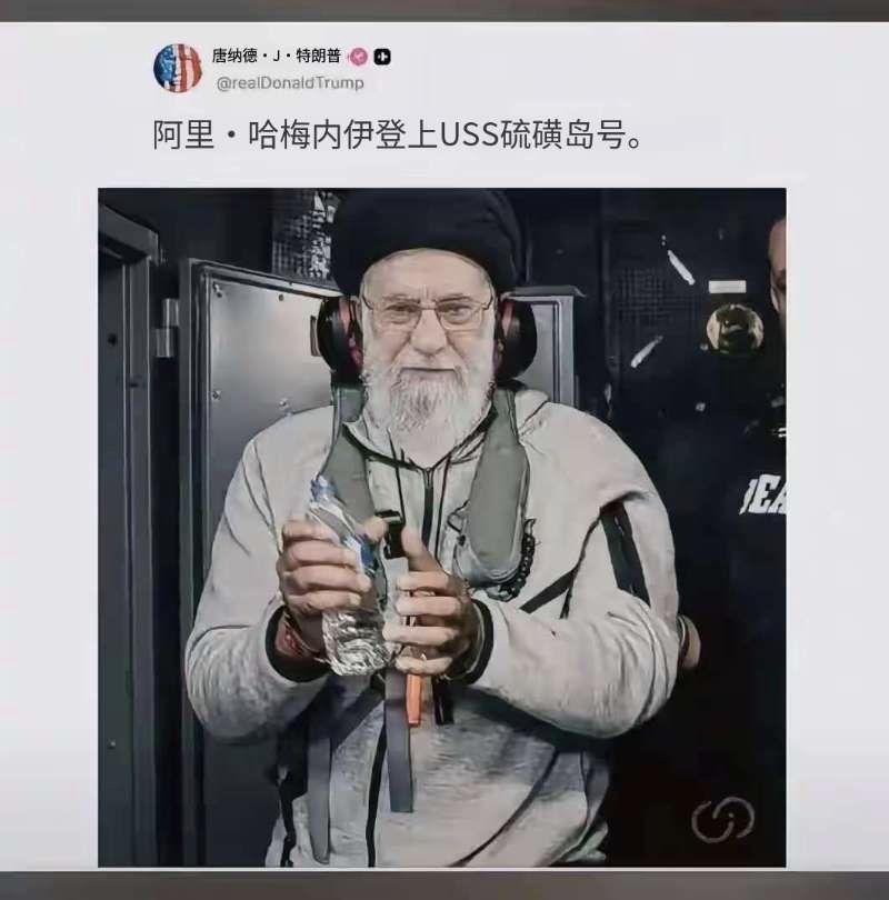 特朗普挑衅,发出一张伊朗精神领袖哈梅内伊貌似戴着手铐、在武装直升机上的图片。配文说到:哈梅内伊登上USS硫磺岛号。 USS硫磺岛号指的是美国海军中以硫磺岛命名的多艘军舰。其中最著名的是“硫磺岛”号两栖攻击舰,它是一艘大型两栖作战舰艇,主要用于搭载和部署海军陆战队、直升机、垂直起降战斗机及登陆艇,执行两栖突击、特种作战等任务。 特朗普自己发出这样一幅图片,想说明什么?恐怕是想说明像抓捕马杜罗一样,抓捕哈梅内伊。 这种挑衅意味很浓,看伊朗如何应对?
