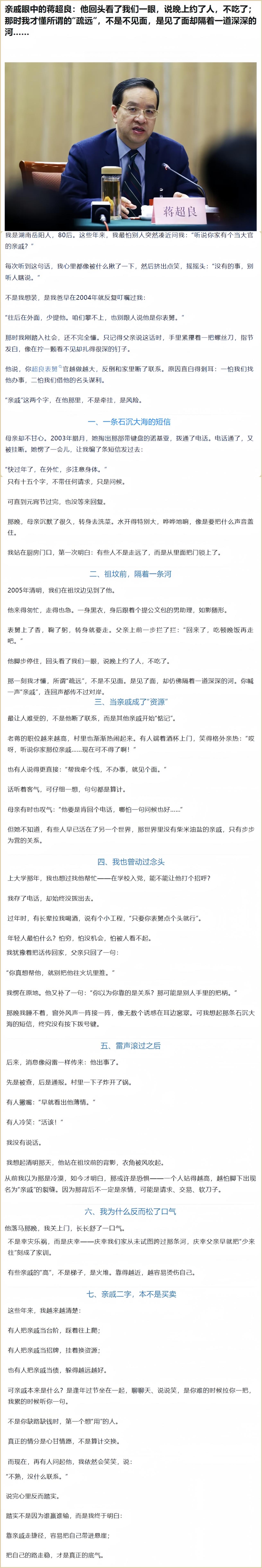 网友流传一篇自称蒋超良外甥的文章,写得那叫一个情真意切。 里面有一句话令人印象深刻:后来我知道,他并非对所有亲戚都这般疏远,官方通报里那句“大搞家族式腐败”,道破了真相。 小编溯源了这篇文章,最早于2025年12月,发布在某信公众号,当天斩获10万阅读量。 最近央视播放反腐专题报道,蒋超良出镜忏悔,这篇文章又被人翻出来吸引眼球。 从叙事角度来看,这篇文章一定是从事文字工作的人(枪手)写的,蒋超良落马后,枪手找了他的相关亲属了解情况,最后成文。 通过类似小说的写法,就是为了制造反差,让人更愿意读下去。 这让我想起了之前网上被封杀的几篇文章,如《一个外地女孩,死在了我出租的公寓》。也是这种写法。 阅读的时候,你说它是虚构的吧,它看起来又很真实,因为里面有很多具体细节让你身临其境,感觉不像编的。你说它真实吧,他看起来和网络小说中的描写雷同,好像嫁接了某个有身份的人的经历。 真真假假叫你分不清楚。 我仔细想了一下,这篇文章表达了一个什么思想呢? 有一些隐隐的埋怨,因为亲属的关系,自己总受到议论。虽然既没有沾到光,又没有遭殃。但是心有“不甘”。