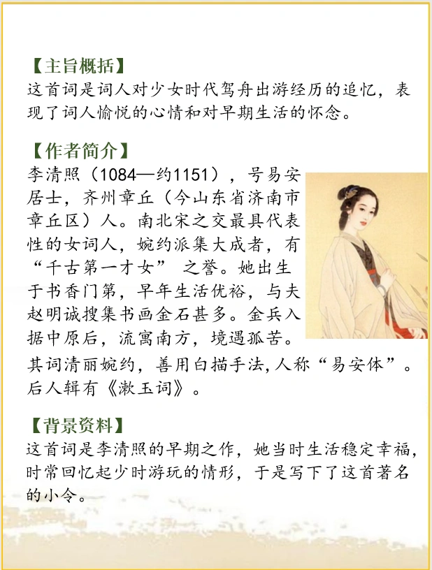 这首词是李清照的早期之作,她当时生活稳定幸福,时常回忆起少时游玩的情形,于是写下了这首著名的小令。