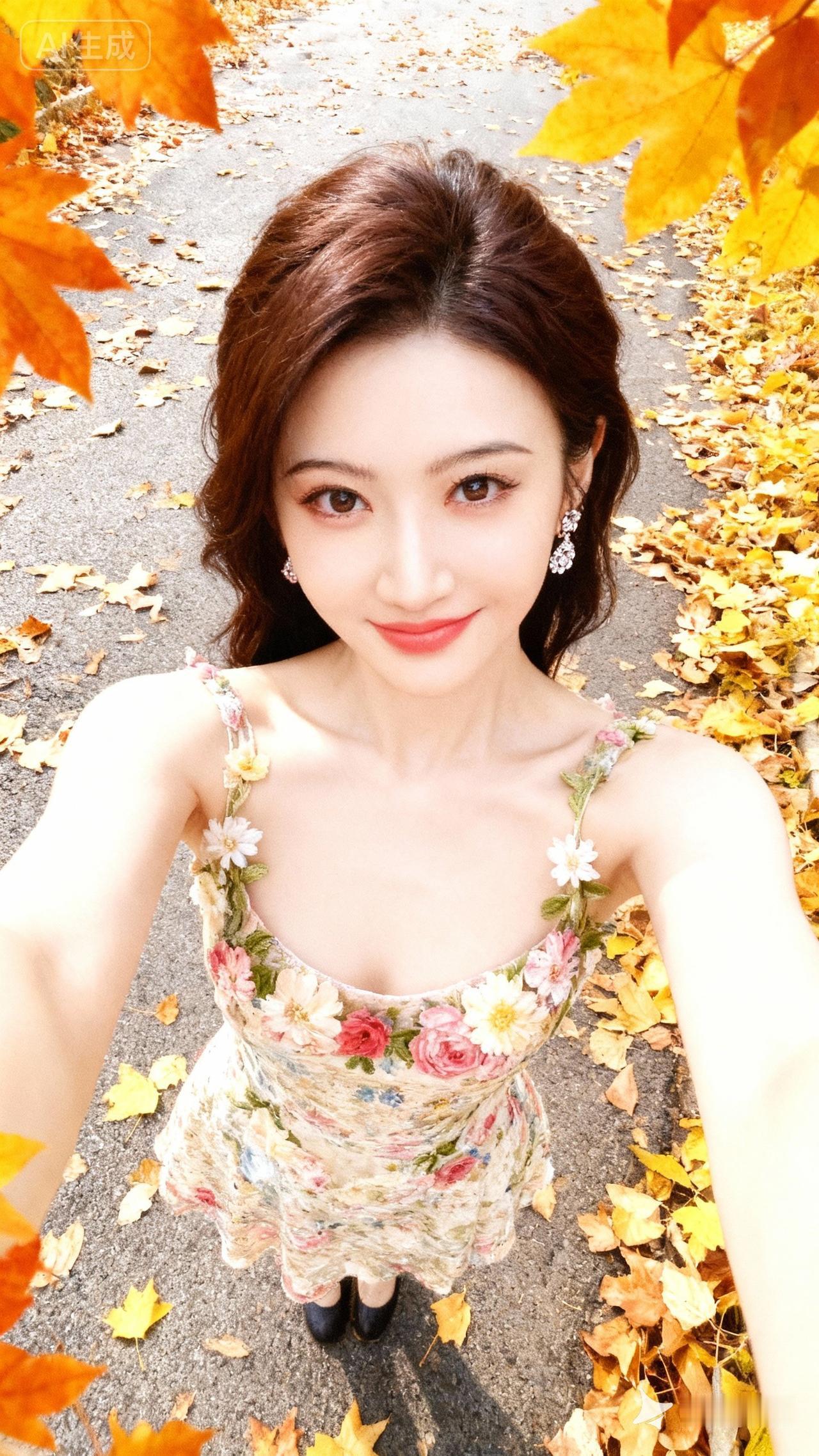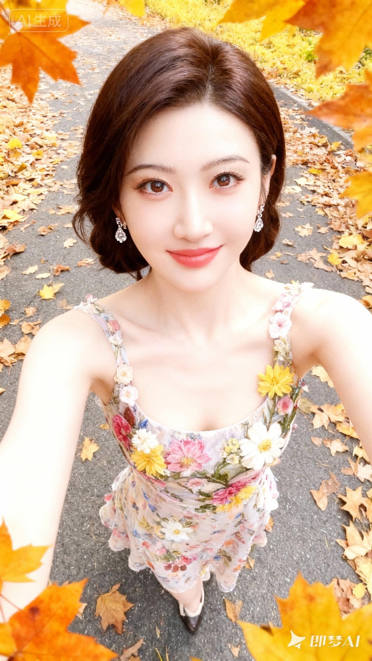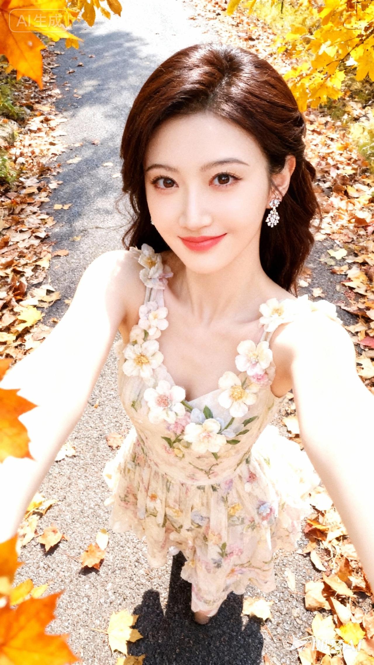 秋日暖阳下,少女漫步在落叶铺满的小径上,笑靥如花。