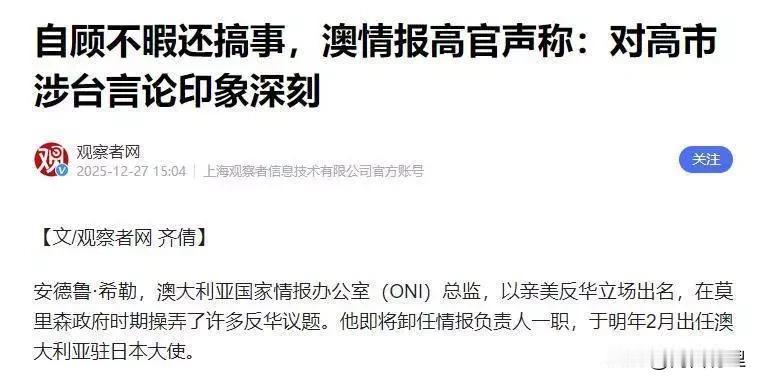 “逮着耗子当龙肉”?高市外交贻笑大方,澳洲“口头支棱”也敢叫强援! 高市早苗四处碰壁,急得像热锅上的蚂蚁。这时候,澳大利亚候任驻日大使希勒冒出来说了一句“对你的涉台言论印象深刻”,高市立马就觉得自己有“强援”了?这未免太把自己当回事了。 这哪是结盟,分明是“话术碰瓷”。 希勒嘴上说着“深刻”,心里算的却是另一笔账。他特意强调“防止台海冲突”,翻译过来就是:我不下场,别想拉我垫背。 澳大利亚之前被莫里森带坑里过,GDP都跌了,现在正忙着修好对华关系。特朗普连盟友都要加税,他们这时候敢跟中国硬刚?不过是借高市的热度,给自家在印太战略里刷点存在感罢了。 高市的“包围网”?不过是花钱买寂寞。 美国苦心多年都没织成的“网”,高市砸下1.1亿美元就想成事?这点钱分给十二个国家,一人一杯奶茶钱。中亚吃了闭门羹,欧洲忙着自保,现在就靠一句“口头支棱”,就敢号称战略转折点? 说到底,澳大利亚那句“深刻印象”,在他们那是外交辞令,在高市眼里就成了救命稻草。可悲的是,她忘了——稻草是浮在水面上的,抓得越紧,沉得越快。她现在这种“逮着耗子就当龙肉”的外交,除了暴露日本的虚弱和焦虑,啥也证明不了。 高巿早苗