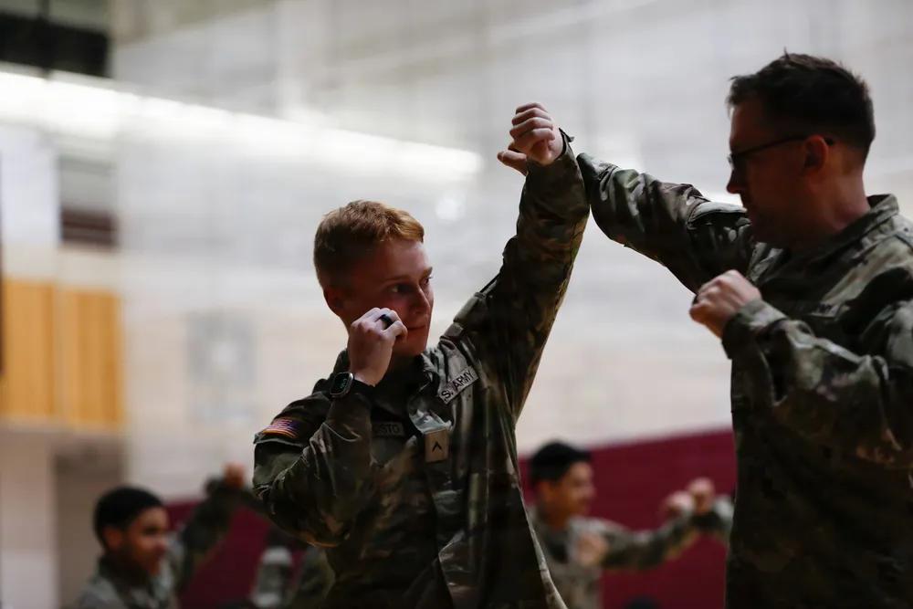 韩国人聪明利用驻韩美军推广跆拳道。 2026年1月9日,美军第一通信旅的士兵于在韩国汉弗莱营Collier社区健身中心参加跆拳道黄带晋升测试。照片中的士兵们正在练习直拳。该测试旨在评估士兵过去一个月训练中的基本跆拳道技能,并促进旅内的体能准备和纪律。