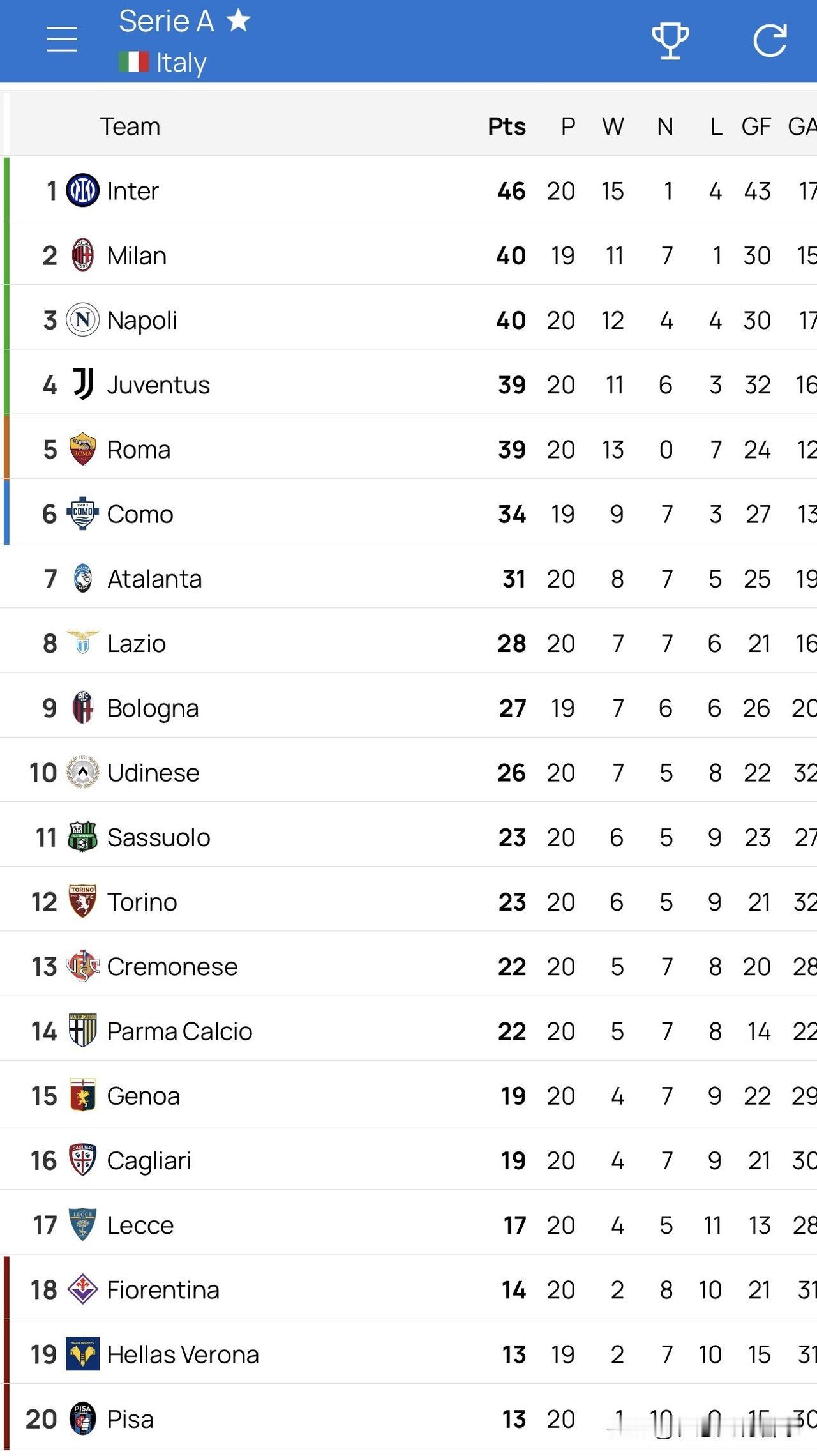 随着补赛国米1:0莱切,那不勒斯0:0帕尔马,意甲最新半程积分榜出炉,国米以6分(米兰少赛一场)的优势正式夺得意甲半程冠军 国米的虐菜能力正在帮助他们拉开那不勒斯和米兰的积分差距。而孔蒂不会多线作战的缺点是被真正实锤放大了,虽然夏天买了很多人,但是依旧无法摆脱多线作战必拉垮的结局。 积分榜上,国米第一,米兰第二明天补赛有希望缩小积分差距。而尤文图斯、罗马正式宣告了对那不勒斯的迫近,如果那不勒斯无法获得下赛季欧冠席位,那就正合孔蒂之意了[大笑]。