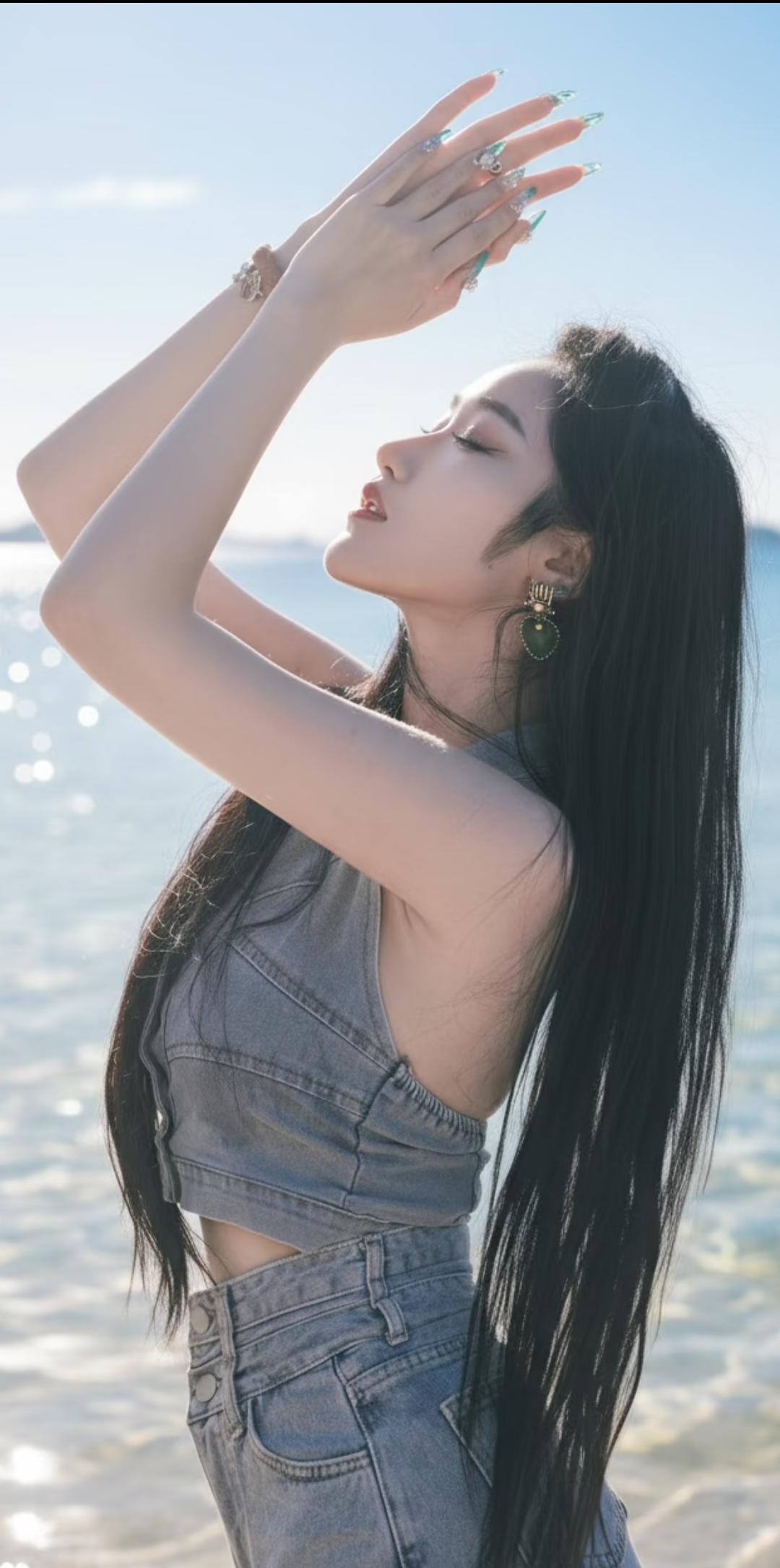 光之影夏日海边少女,牛仔风穿搭,阳光下的自由与美好。海边粉衣少女海边女神穿