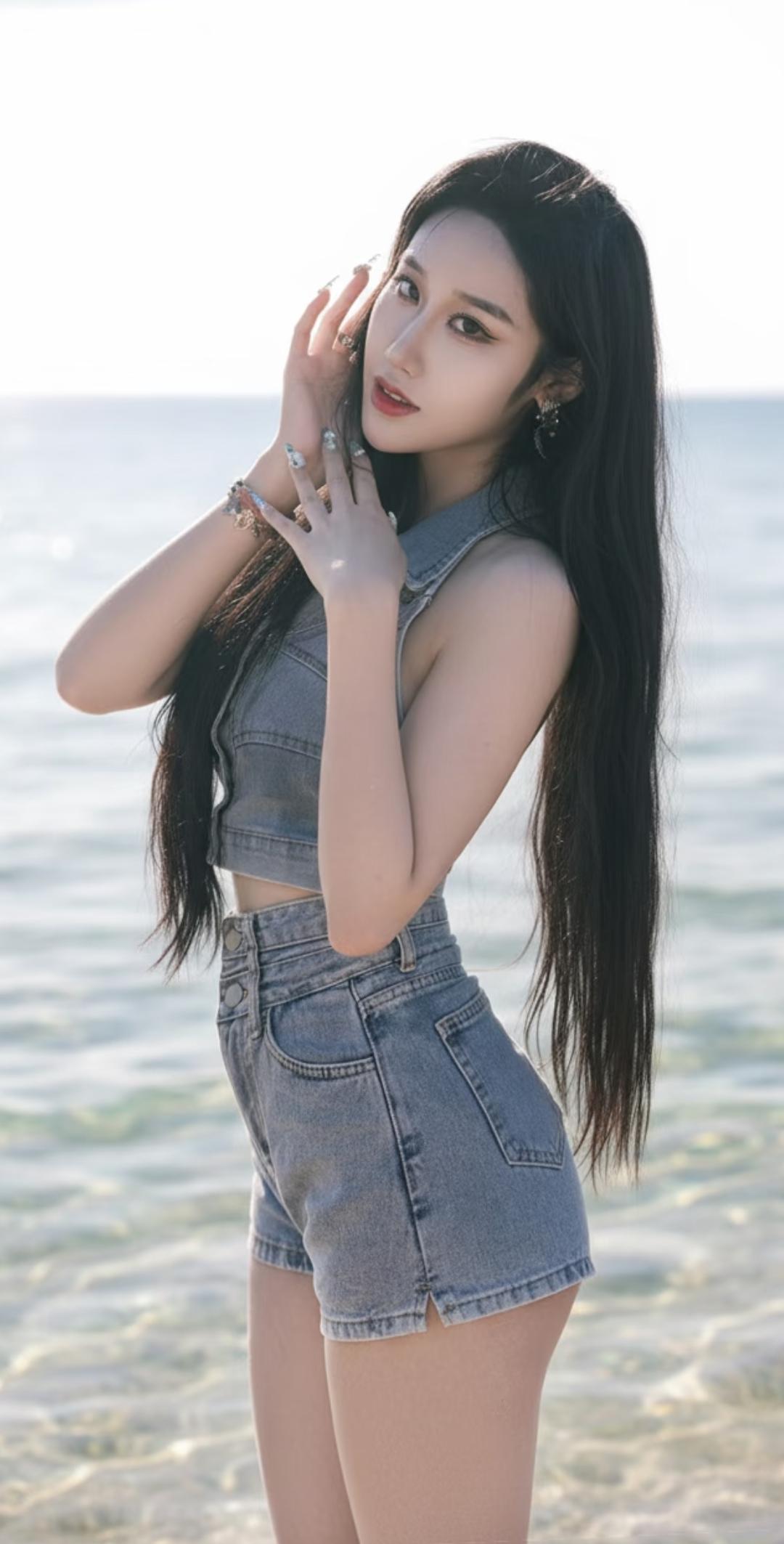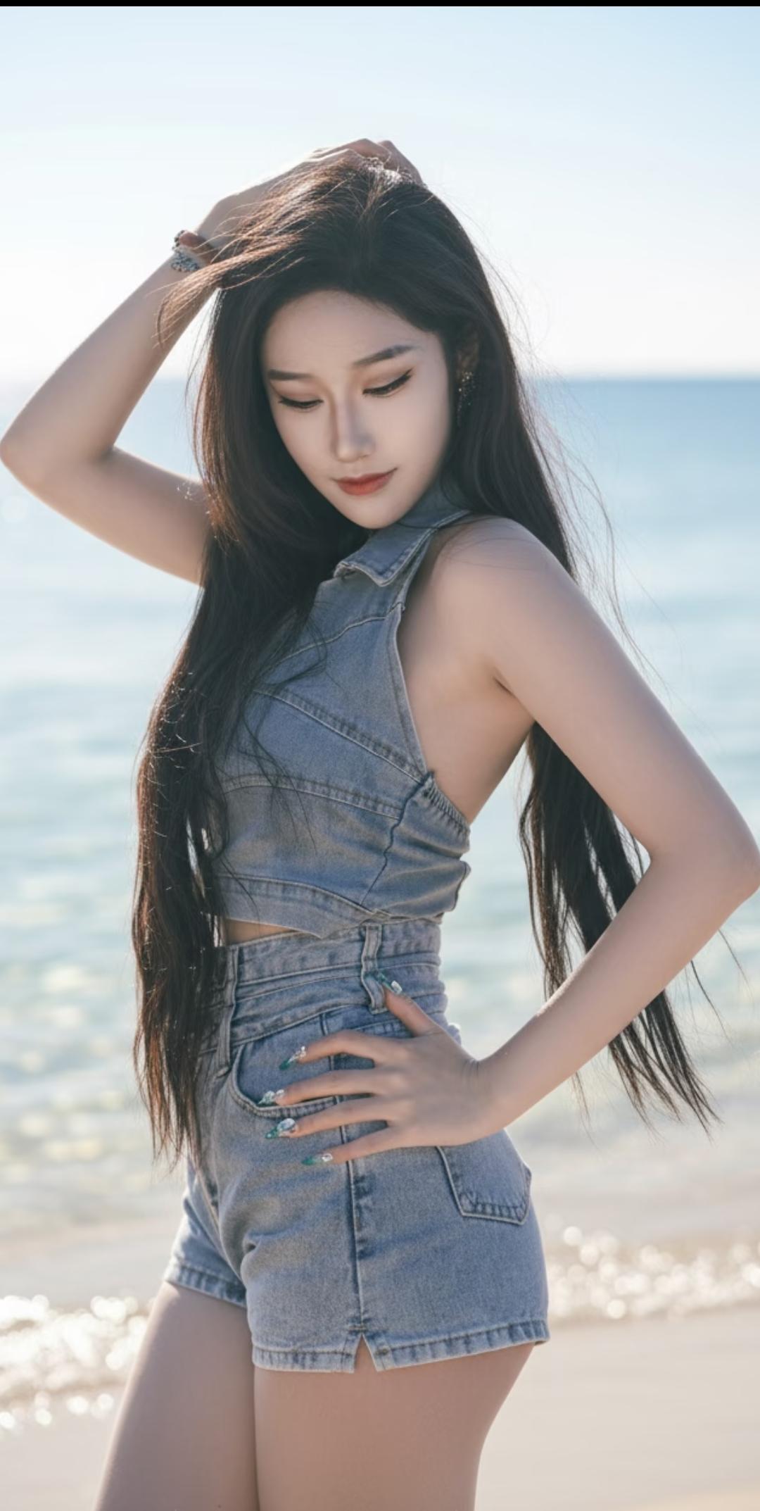 海边美女穿牛仔,好酷啊!
