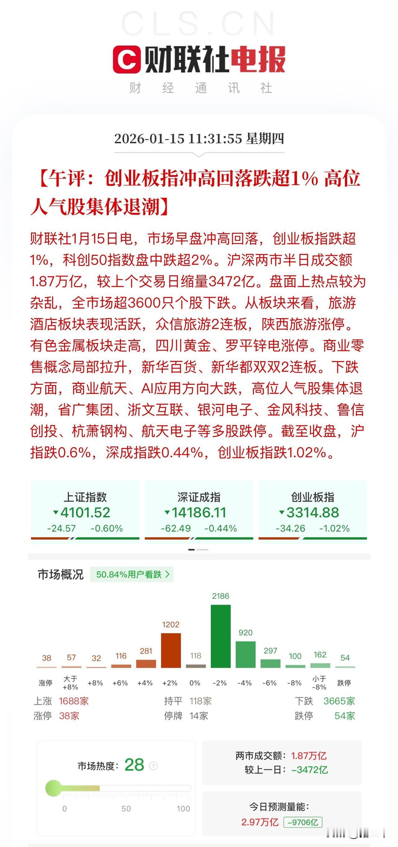 午评,题材退潮业绩股更进一步! 沪深两市半日成交1.87万亿, 下午若无板块大涨抢眼表现, 那么预计全天成交2.5万亿! 上午涨跌停比38:54肯定没法看的, 但不妨碍年报主线业绩行情发酵: 电池板块越走越强, 固态电池、储能、能源金属大幅领先, 利元亨、先导智能、海博思创、天齐锂业、赣锋锂业、永太科技、新宙邦机会都很好。 存储芯片也是机会, 目前是百威存储、东材科技局部发酵, 但盘中也看到江波龙、德明利资金布局动作, 这一条线就是去装前期新高的! 端侧Ai今天大面积回撤, 泓博医药跌停、因赛集团等大跌, 这个方向调整下来是机会! …