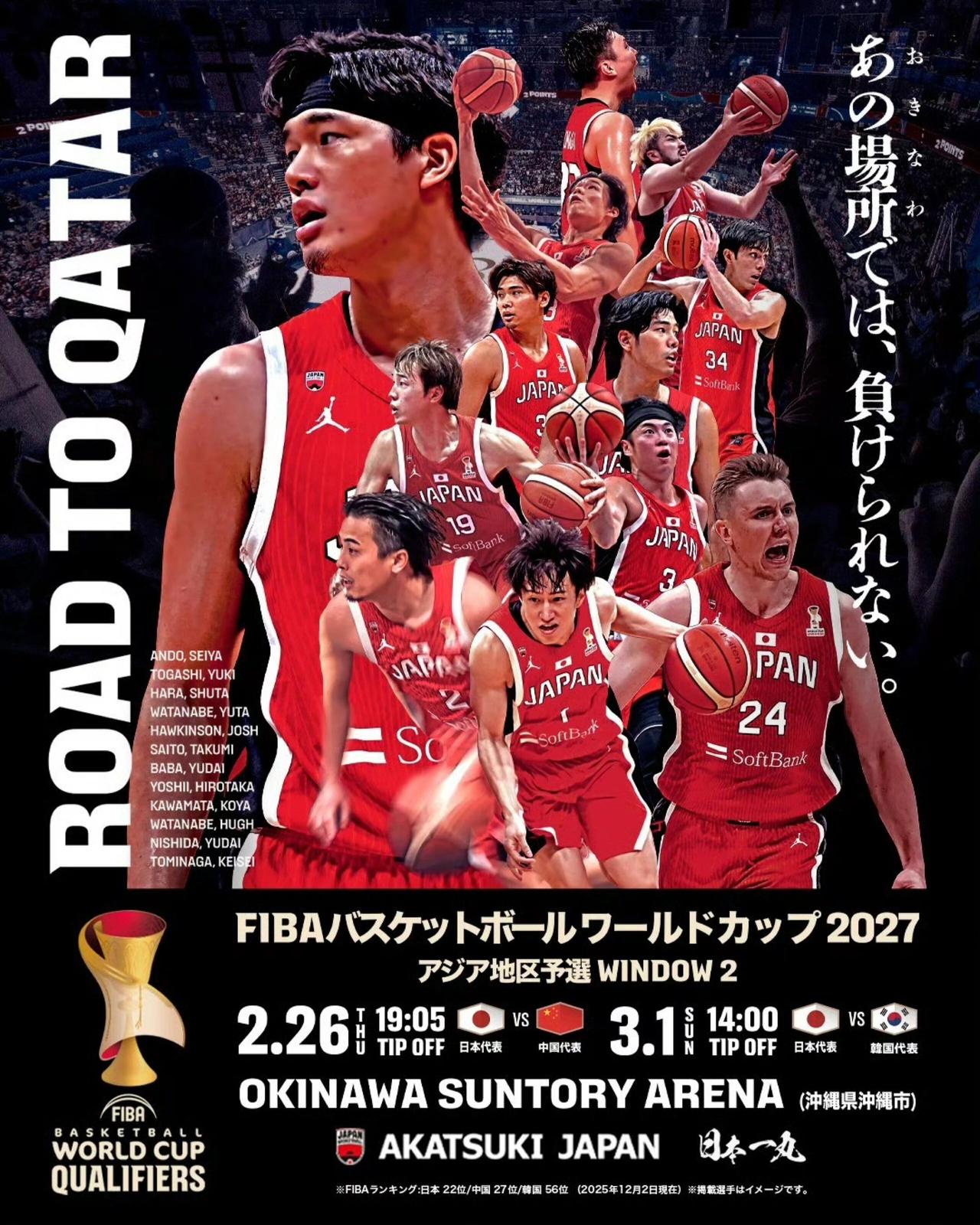 世界杯亚洲区预选赛中国男篮⛹️♂️最大的对手日本男篮官宣海报发布:渡边雄太领衔,河村勇辉、八村罍不在阵中这对中国男篮是个好消息! 2026年2月26号大年初十晚上18:00中国男篮客场挑战日本男篮。之前二负韩国中国男篮跌入谷底。证明之战的重要性不言而喻!不到40天留给中国蓝协主教练郭仕强的时间真不多了。集训名单还没出,广大球迷干着急呀!