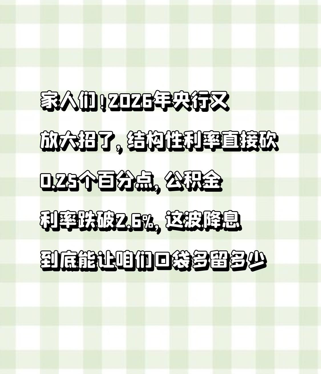 降息 家人们!2026年央行又放大招了,结构性利率直接砍0.25个百分点,公积金利率跌破2.6%,这波降息到底能让咱们口袋多留多少钱?看完这条视频,每月少花几百块的秘诀直接拿捏! 先给大家算笔实在账:100万30年的公积金房贷,以前月供4136元,现在直接降到4003元,每月省133元,总利息少掏4.76万!相当于白拿一年物业费+全家旅游基金 。不仅房贷,车贷、装修贷也跟着降,山东日照的张先生30万3年装修贷,直接省出3600元,刚好换台新冰箱 。更狠的是车贷,有人从10%利率降到6.64%,月供少还894元,整个还款期省出一辆比亚迪! 但这里有个关键转折,千万别以为降息就是“闭眼借钱”!首先,存量公积金贷款要到2026年1月1日才调降,现在还贷的朋友别急着改方案;其次,商业房贷要看LPR走势,一线城市首套最低3.05%,但二套房利率没降多少,投资买房要谨慎 。还有个坑:存款利率可能跟着降,把钱全存银行反而不划算,不如用来提前还高息贷,或者配置稳健理财。 对普通人来说,这波政策真的是“及时雨”。打工族的房贷压力轻了,小微企业贷款年省好几万,创业者能大胆扩产能了 。央行说了,2026年还可能再降息2次,流动性一直充裕 。不管你是准备买房、换车,还是想给生意周转,现在都是盯紧利率的好时候。 其实咱们老百姓要的很简单:房贷少还点,消费敢放开点,日子过得宽裕点。这波降息不是让大家盲目花钱,而是给努力生活的人多一份底气。评论区说说,你每月能省多少钱?准备怎么花这笔“意外之财”?关注我,后续利率变动第一时间通知你!