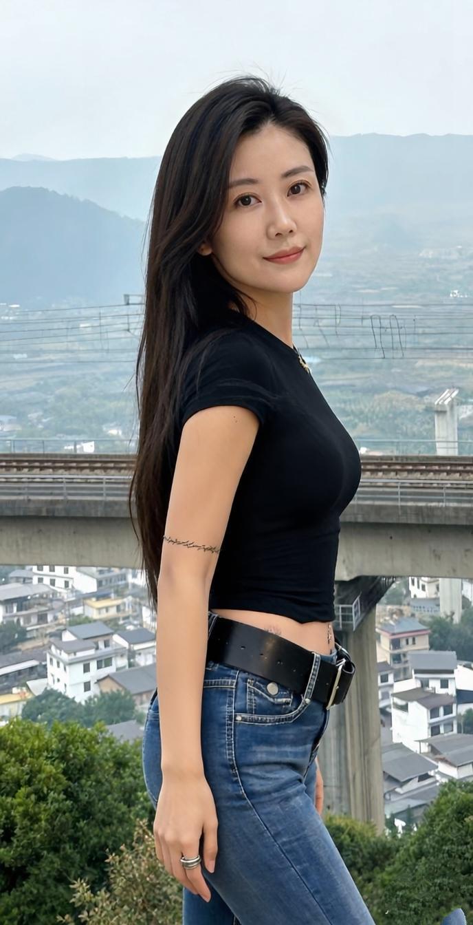 黑衣美人倚栏杆,风姿绰约似画卷。