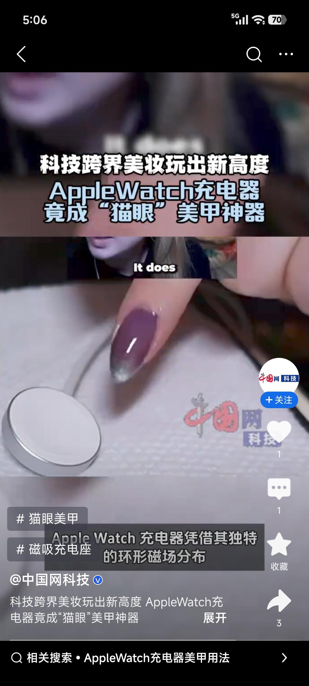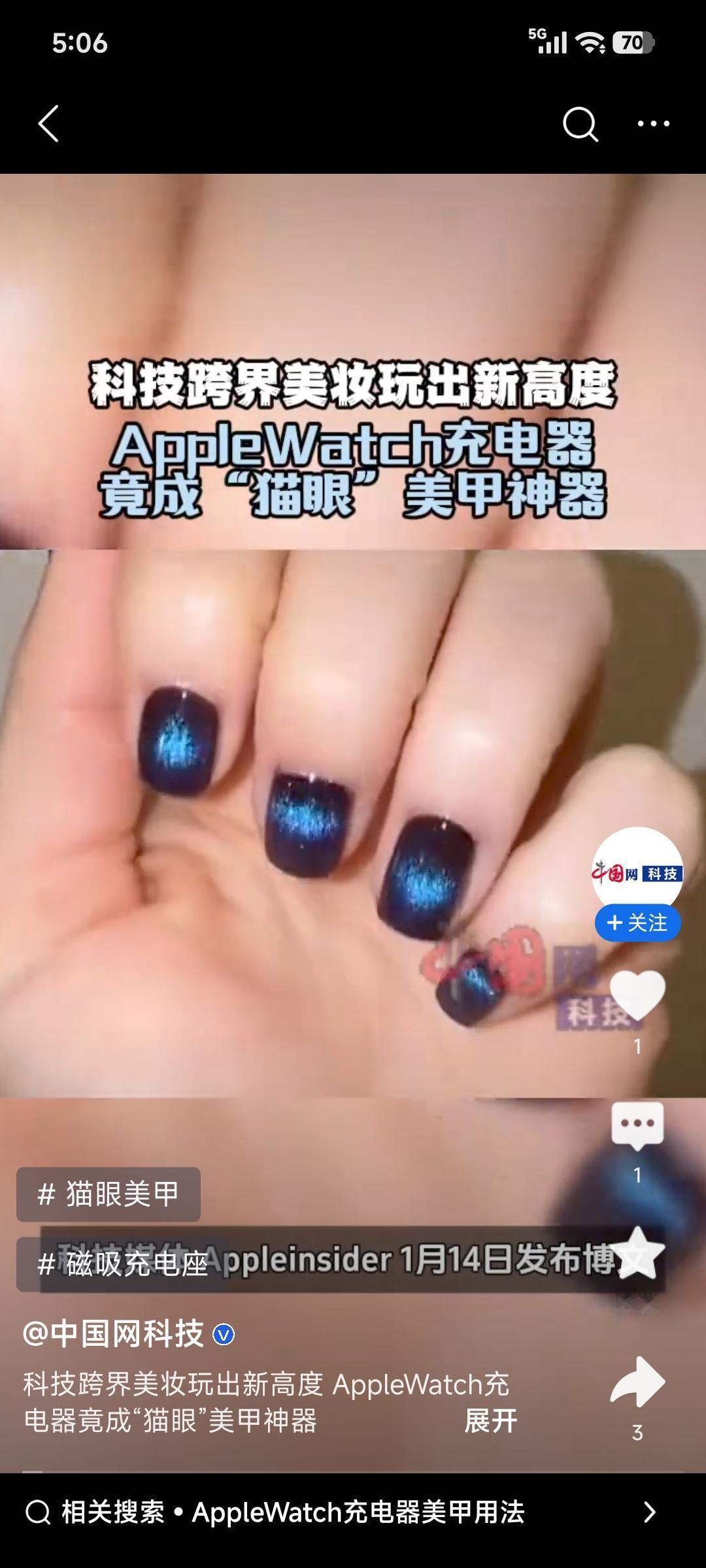 家人们,Apple Watch充电器摇身一变成美甲神器这事太绝了!以前做“猫眼”美甲,得专门花几十块买美甲磁铁,现在有Apple Watch的直接用充电器就行。 “猫眼”指甲油含细小金属粉末,没干时用磁场靠近,金属粉末移动形成光带纹理。Apple Watch充电器环形磁场分布独特,能做出与众不同的渐变纹理。操作简单,手指贴充电器磁吸面,涂指甲油,一分钟左右就能有蓝黑渐变效果。和去美甲店做的比,光带更细腻还不翻车,零成本白嫖美甲工具,性价比直接拉满,科技果然总能带来惊喜!