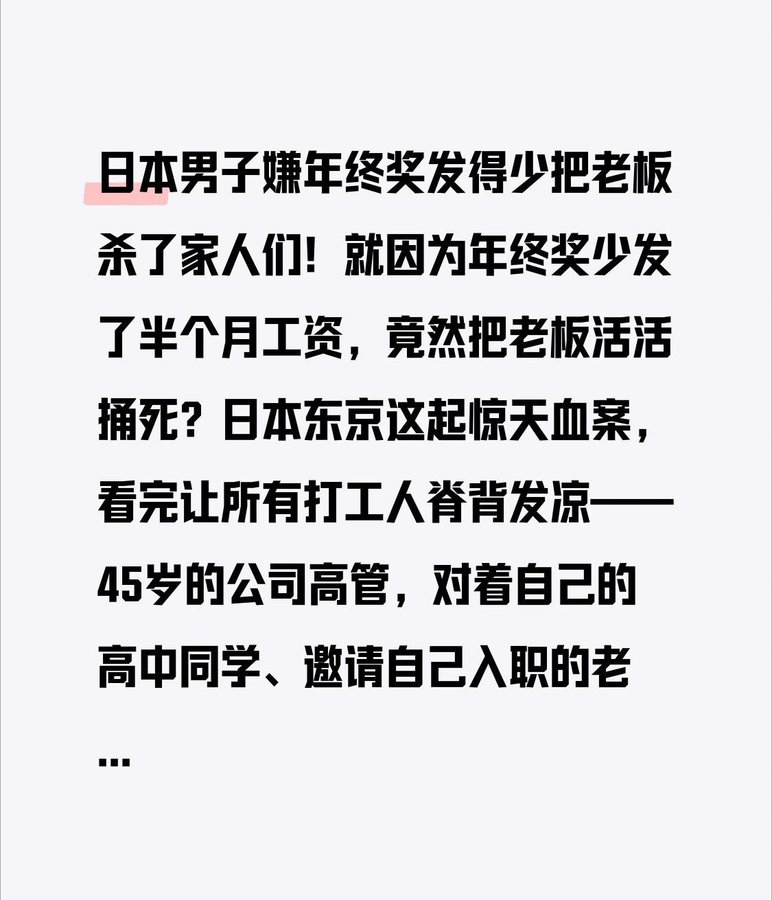 日本男子嫌年终奖发得少把老板杀了 家人们!就因为年终奖少发了半个月工资,竟然把老板活活捅死?日本东京这起惊天血案,看完让所有打工人脊背发凉——45岁的公司高管,对着自己的高中同学、邀请自己入职的老板,连刺10多刀,颈部腹部全是致命伤,昔日兄弟为啥会走到这一步? 事情远比你想象的扎心!被害的44岁社长河岛明宏,和凶手山中正裕是高中同学,关系好到能出席对方婚礼。四年前,河岛特意邀请有多年行业经验的山中加入自己的音响设备公司,让他当营业部长,承诺的待遇比之前公司还好。谁能想到,四年后竟是这样的结局。 警方调查后揭开真相:去年12月发年终奖时,山中发现自己的奖金从1.5个月工资,悄悄降到了1个月,关键是老板没给任何解释!这不是钱的事,而是被忽视的羞辱感——山中之前多次跟河岛提过公司管理和待遇问题,每次都石沉大海,这次降薪成了压垮骆驼的最后一根稻草。他在审讯时说:“我反复说他不听,只能让他经历痛苦,才能逼他改变想法”。 但这里有个致命转折:这真的是“年终奖杀人”吗?其实背后藏着日本职场最残酷的潜规则!在日本,奖金看似是浮动收入,实则早成了员工心中的“默认承诺”,降奖金不只是少赚钱,更是被公司否定的信号。更可怕的是,日本职场推崇“忍耐文化”,员工有不满不敢当面爆发,只能默默积压,可情绪不会消失,只会在某个节点彻底炸锅。 更让人唏嘘的是,这不是个例!日本厚生劳动省数据显示,职场霸凌相关咨询连续9年排第一,因职场压力导致的精神疾病劳动灾害,11年增长了10倍。很多打工人和山中一样,面对上级的忽视、不公,只能忍了又忍,可忍耐从来不是解决问题的办法,只会让矛盾越积越深。 但必须明确:暴力绝对不可取!山中一时冲动,毁了两个家庭——自己面临终身监禁,老板的家人失去至亲,公司也陷入瘫痪。其实不管是员工还是老板,沟通才是救命绳:老板降薪前多一句解释,员工有不满找对渠道倾诉,都不会走到这一步。 想想我们身边,谁没遇到过职场委屈?可能是承诺的奖金没兑现,可能是辛苦付出不被认可,可能是沟通无效只能内耗。但再大的不满,也不能用极端方式解决,毕竟生命只有一次,体面和底线不能丢。而作为管理者,也该明白:员工要的不只是薪水,更是尊重和知情权。 这起血案给所有打工人和老板敲响警钟:职场不是战场,没必要拼个你死我活。多一份理解,少一份冷漠;多一次沟通,少一次积怨,才能避免悲剧重演。 评论区说说,你遇到过不公的职场待遇吗?你是怎么处理的?关注我,带你看透更多社会真相,愿每个努力工作的人,都能被温柔以待!