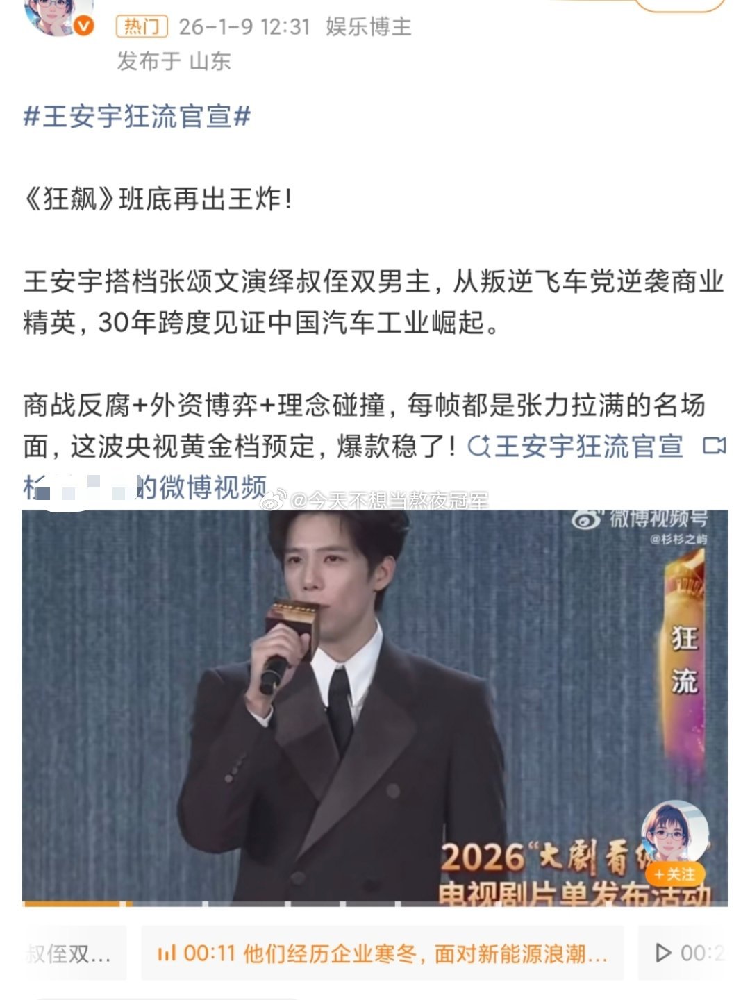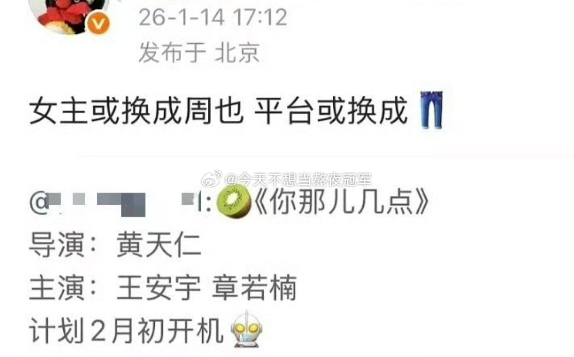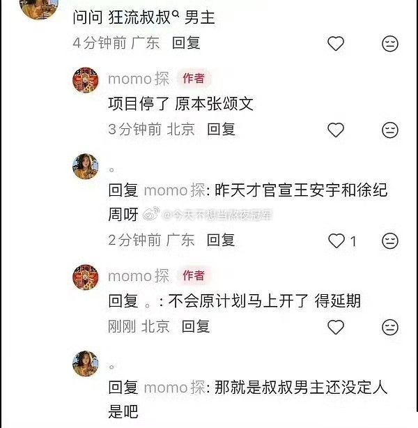 🍉🍉桃连着退了王安宇两部剧,班底全部大换血。。。《狂流》张颂文跑路,一季度开不了机。《你那儿几点》原定女主章若楠也不演了,换成了周也。你那儿几点 王安宇疑似张颂文不演狂流了