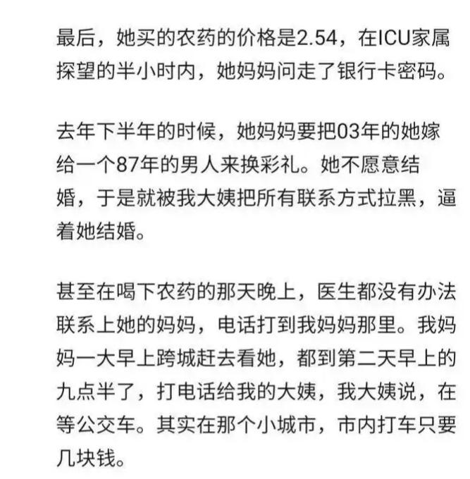 湖北仙桃不堪逼婚喝农药的23岁女孩身世太惨了,亲妈逼她嫁给39岁的男人换彩礼。女孩从小被亲爹不待见,暴力殴打从楼梯上摔下脑子摔坏,没有读啥书,没有朋友,靠做保安3000的工资生活,好不容易攒了6万块钱,却被平时不闻不问的亲妈拿走。逼她她结婚,女孩想不开,花2.4元买的敌草快喝了。这个农药和百草枯类似,会搞坏五脏六腑,很难治。亲妈去到医院,不是关心女儿,而是逼问银行卡密码。目前在ICU,医疗费是天文数字,家属在发起筹款。逼婚经历