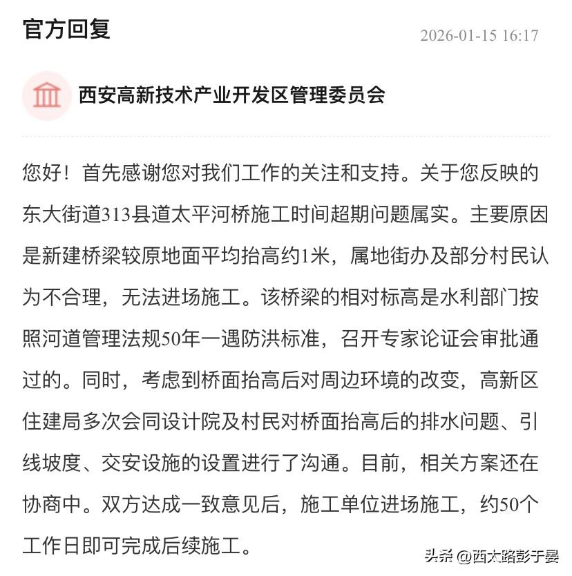 东大街道313县道太平河桥何时通车 去年公告通知东大街道313县道太平河桥施工时间为2025年2月到6月,工期4个月,现在已经超期半年多了,迟迟还没有通车。想咨询一下领导,这座桥何时能修好?何时通车? 官方回复 2026-01-15 16:17 西安高新技术产业开发区管理委员会 您好!首先感谢您对我们工作的关注和支持。关于您反映的东大街道313县道太平河桥施工时间超期问题属实。主要原因是新建桥梁较原地面平均抬高约1米,属地街办及部分村民认为不合理,无法进场施工。该桥梁的相对标高是水利部门按照河道管理法规50年一遇防洪标准,召开专家论证会审批通过的。同时,考虑到桥面抬高后对周边环境的改变,高新区住建局多次会同设计院及村民对桥面抬高后的排水问题、引线坡度、交安设施的设置进行了沟通。目前,相关方案还在协商中。双方达成一致意见后,施工单位进场施工,约50个工作日即可完成后续施工。