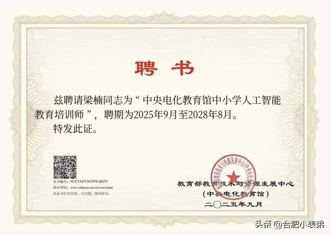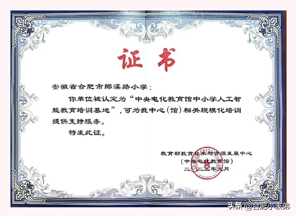 晒图笔记大赛学在瑶海,实至名归![赞][赞][赞] 教育部教育技术与资源发展中心(中央电化教育馆)公布第四批中小学人工智能教育培训基地与培训师名单,瑶海教育传来捷报! 合肥市第三十八中学北校、合肥市郎溪路小学成功入选央馆人工智能教育培训基地,且两所学校在初中、小学学段均为合肥市唯一入选校!同时,三十八中北校梁楠老师获评“央馆中小学人工智能教育培训师”。 硬核实力加持,瑶海教育持续发力,为优质教育点赞!
