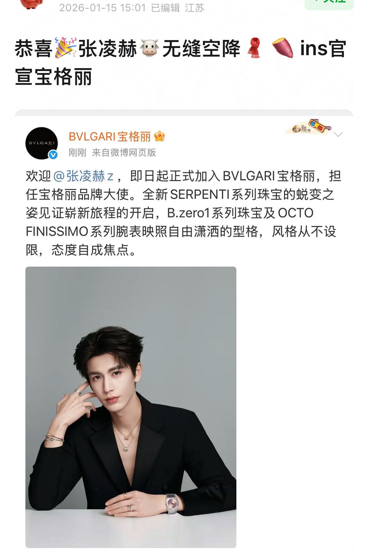 📣张凌赫宝格丽官宣,第二次高奢无缝无考察期空降,内外网同步官宣,推封五大,成为95生第一且唯一跳过VT二小登五大的男演员。凌帝🐮比!