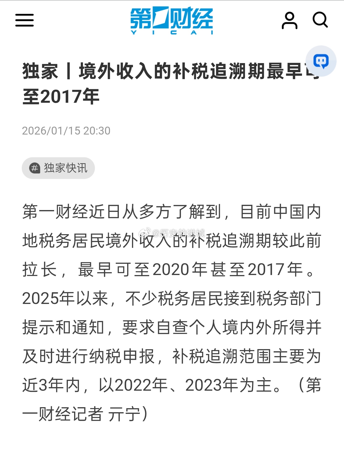 第一财经近日从多方了解到,目前中国内地税务居民境外收入的补税追溯期较此前拉长,最早可至2020年甚至2017年。2025年以来,不少税务居民接到税务部门提示和通知,要求自查个人境内外所得并及时进行纳税申报,补税追溯范围主要为近3年内,以2022年、2023年为主。