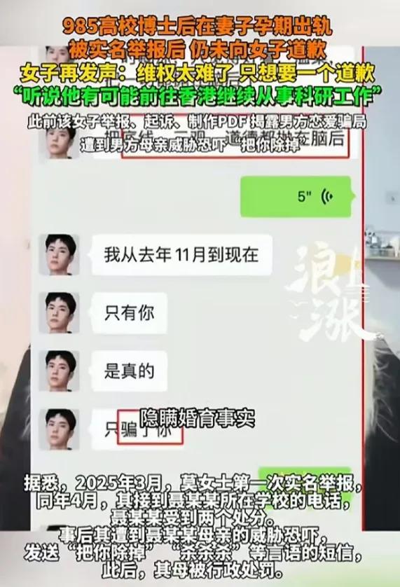 北京法学高材生相亲遇诈!男友博士后人设崩塌,备注老板竟是正妻,莫名成小三还遭报复 本以为狗血剧才有的剧情,现实里更扎心!北京莫女士满心找结婚对象,偏偏遇上精心布局的谎言,身为法学系高材生的她,不仅被爱情假象蒙骗,还稀里糊涂沦为第三者,事后遭对方家人报复,精神崩溃患上抑郁,这场真诚奔赴终究成了一场噩梦。 2024年,适婚年龄的莫女士,抱着不搞暧昧、只求真诚婚恋的想法,在相亲账号登记,简介里明确标注要找未婚、有结婚规划的伴侣,她始终坚信,真诚是感情里最基本的底线。 没多久,男子聂某某主动搭讪,条件简直长在了莫女士的期待点上:985博士后、1991年生、身高178cm,外形周正还温柔体贴,每次见面鲜花从不缺席,相处时处处照顾她的情绪,这般用心,让两人感情火速升温,很快确定恋爱关系。 之后每周一见,聂某某会分享工作日常、倾听她的烦恼,还会描绘两人未来在北京定居的温馨画面,可甜蜜背后,反常细节渐渐浮现。 聂某某总在某些时刻突然失联,消息回复迟缓,问起缘由只说是工作忙、陪“老板”应酬,次数多了,莫女士难免起疑:难道他脚踏两只船? 为了求证,莫女士借手机没电要订外卖为由,拿到了聂某某的手机,假装点外卖的间隙,她点开微信,直奔那个备注“老板”的联系人,可对话框里哪里是上下级沟通,全是夫妻间的日常叮嘱,“孩子今天又闹了”“晚上早点回家”的话语瞬间让她懵了。 还没等她反应过来,聂某某母亲发来的消息弹了出来,附带一段婴儿视频,配文“宝宝今天笑了,抽空多陪陪他”,视频里孩子眉眼和聂某某如出一辙,莫女士大脑一片空白,真相如惊雷劈下。 翻看更多聊天记录,她彻底心凉:聂某某早已结婚生子,“老板”是正妻,视频里的是他亲生孩子,更让她崩溃的是,两人交往时,聂某某的妻子正怀着孕! 面对铁证,聂某某无法再装,轻描淡写称是妻子孕期无法陪伴,一时糊涂犯了错,这般敷衍的说辞,狠狠刺痛了莫女士。 她真心付出盼着成家,却从始至终活在谎言里,莫名成了插足他人婚姻的第三者,巨大打击让她彻底垮了,失眠焦虑缠身,多次萌生自杀念头,从前乐观开朗的人变得沉默寡言,最终被诊断出焦虑抑郁。 理智尚存的法学系高材生不愿忍气吞声,实名曝光聂某某,很快,聂某某所在事业单位对其作出记过处分,取消评优资格。 可令人气愤的是,聂某某和母亲毫无歉意,反倒对莫女士疯狂报复,聂母多次上门恐吓,放话“你毁了我们家,绝不放过你”,还在她住处附近蹲守堵截,严重影响她的生活与人身安全,莫女士无奈报警,警方仅对聂母罚款200元。 这样的处罚难以抚平伤痛,莫女士最终拿起法律武器,起诉聂某某,要求其公开道歉并赔偿精神损失费5万余元,目前案件仍在审理,聂某某一方只愿赔部分钱款,却始终不肯公开认错。