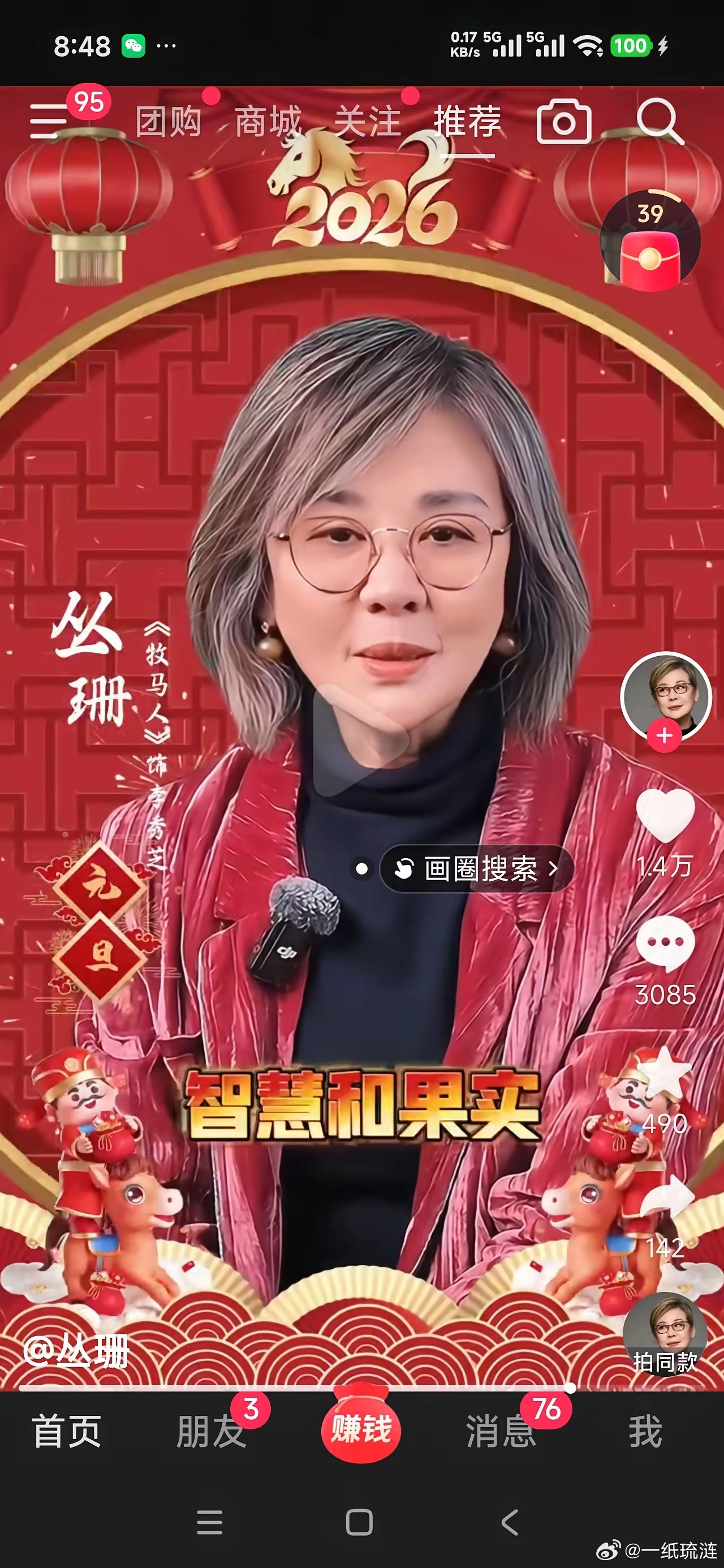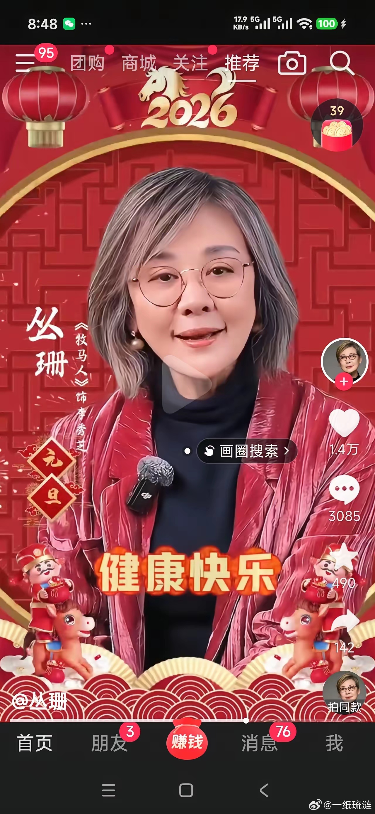 刚刚看到法籍华裔也就是外国人丛珊女士,打扮得和中国月份牌封面一样出镜,用汉语说第一感谢中国人民对她支持!第二祝中国人民在2026年一切都好!丛珊凭借《牧马人》走红,剧中她宣传的是:贫贱不能移的爱国主义情怀,剧外丛珊自己跑法国去了,最终把她自己变成法国人了。放弃了中国国籍加入了外国国籍,这个是丛珊的自由,可丛珊这种做法,对电影《牧马人》的主题思想就是一个反面教材。近些年丛珊又频频在中国出演影视剧出镜,捞钱捞名。喂!丛珊,中国人很厚道的,名气金钱都让你捞着了,没事儿的,你能捞着是你的本事,中国人民不会和你计较的。中国人民就想听你说句实话:最近网上出现的:中戏新疆班里的一个叫石梁一骁的学生,他是你儿子吗?请你回答:“是”,还是“不是”。